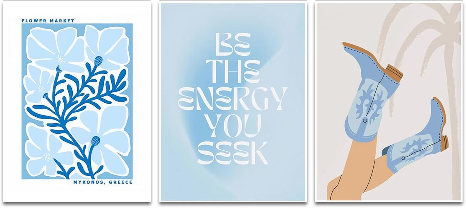 - Modern Cowgirl & Coastal Aesthetic: This set features a vibrant mix of cowgirl boots and flower market prints, bringing the perfect balance of Western and coastal vibes. Whether you're into surfer girl aesthetics or beachy themes, these prints add a laid-back yet trendy touch to any room.