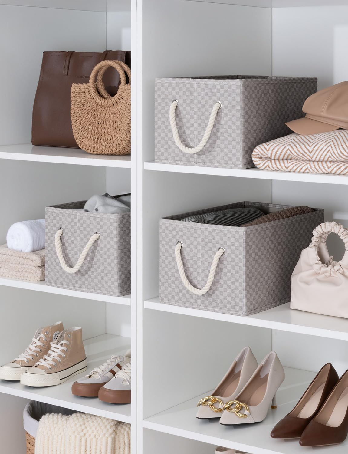 StorageWorks Storage Baskets for Shelves, Foldable Fabric Closet Storage Bins with Handles, Fabric Storage Bins Clothes Organizer, Khaki Check, 3-Pack, Large