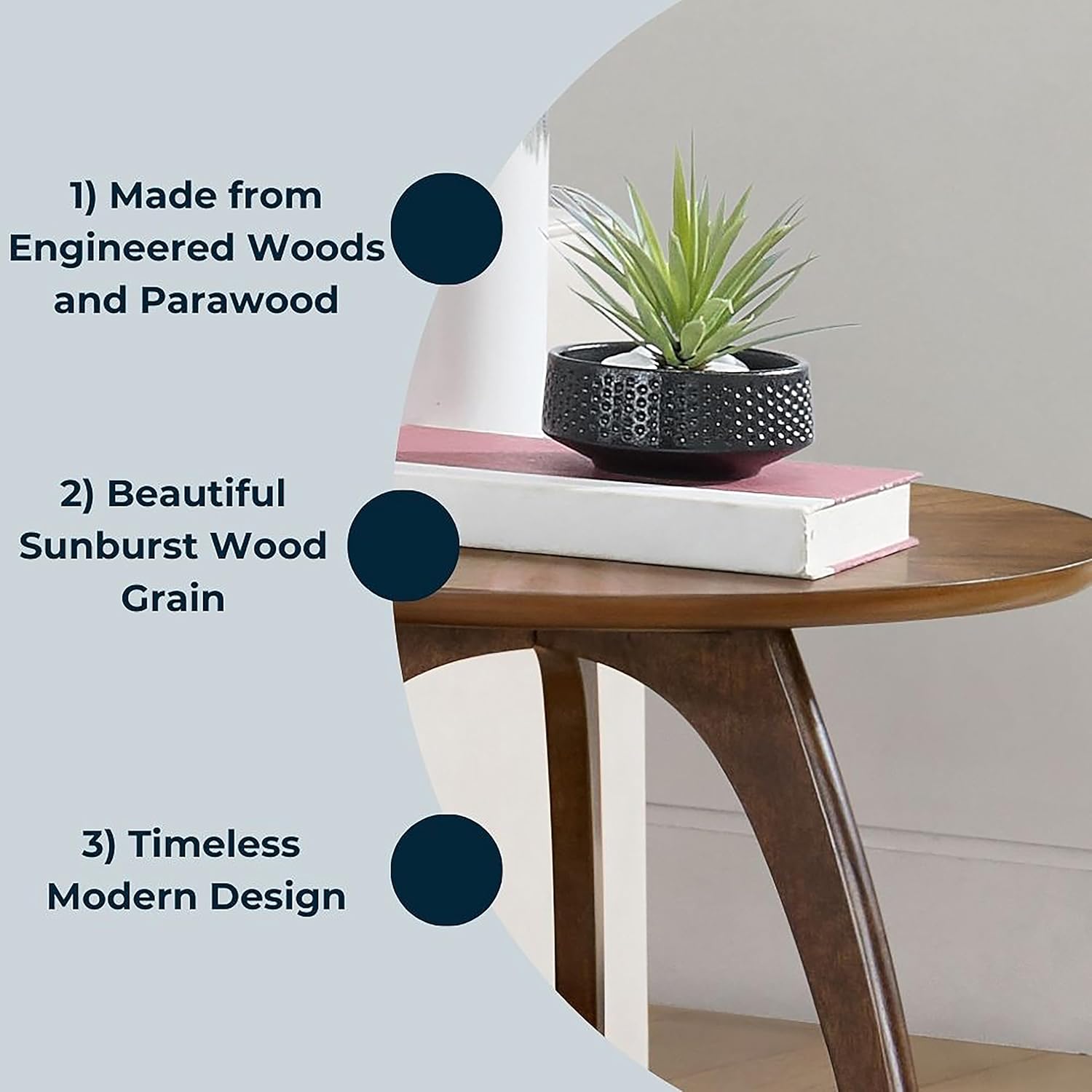 - STUNNING MID-CENTURY MODERN DESIGN – Instantly transform your living space with this sleek round end table. This stunning caramel wood side table with walnut legs effortlessly combines retro charm and modern sophistication, resulting in a striking focal point that enhances any living room or den.