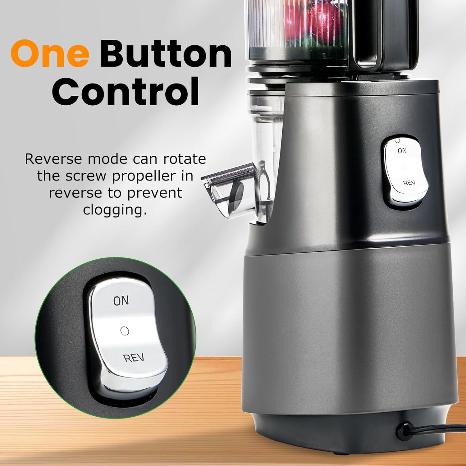 - ăONE BUTTON CONTROLăOne-button design makes your juicing process as simple as possible. There is a reverse mode, if the blockage occurs in the juicing process, just filpping the button can make the juicer rotate in the opposite direction, clear the blockage, and ensure that the juicing is uninterrupted. In the juicing process, if the lid is accidentally opened, the masticating juicer will automatically stop working, and the juicer will not start if the lid is not covered, to ensure the safety of the user
