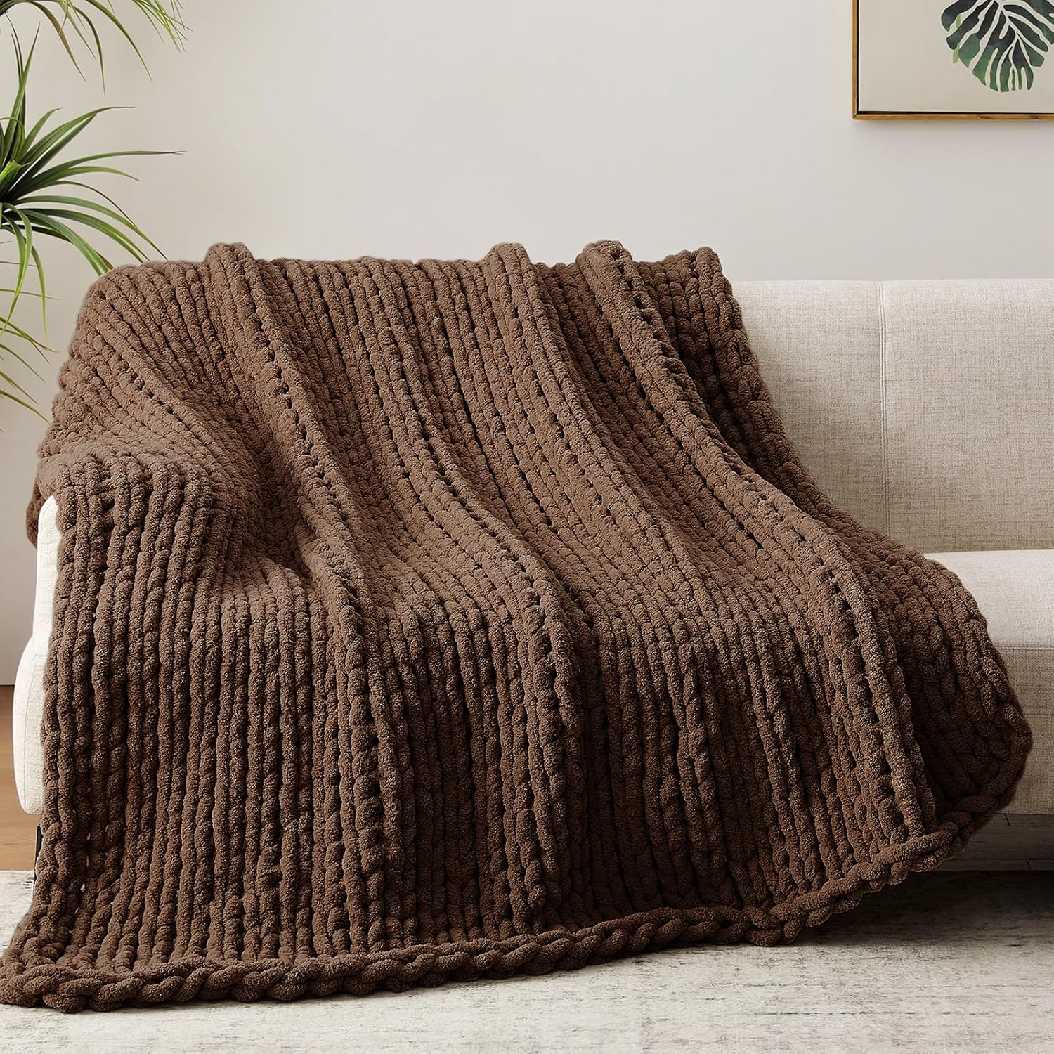 Chunky Knit Throw Blanket, 40''*50'' Knitted Throw Chenille Yarn for Bed Couch, Handmade Dark Brown Crochet Big Thick Blanket, Machine Washable Cute Comfy Blanket for Home Decor