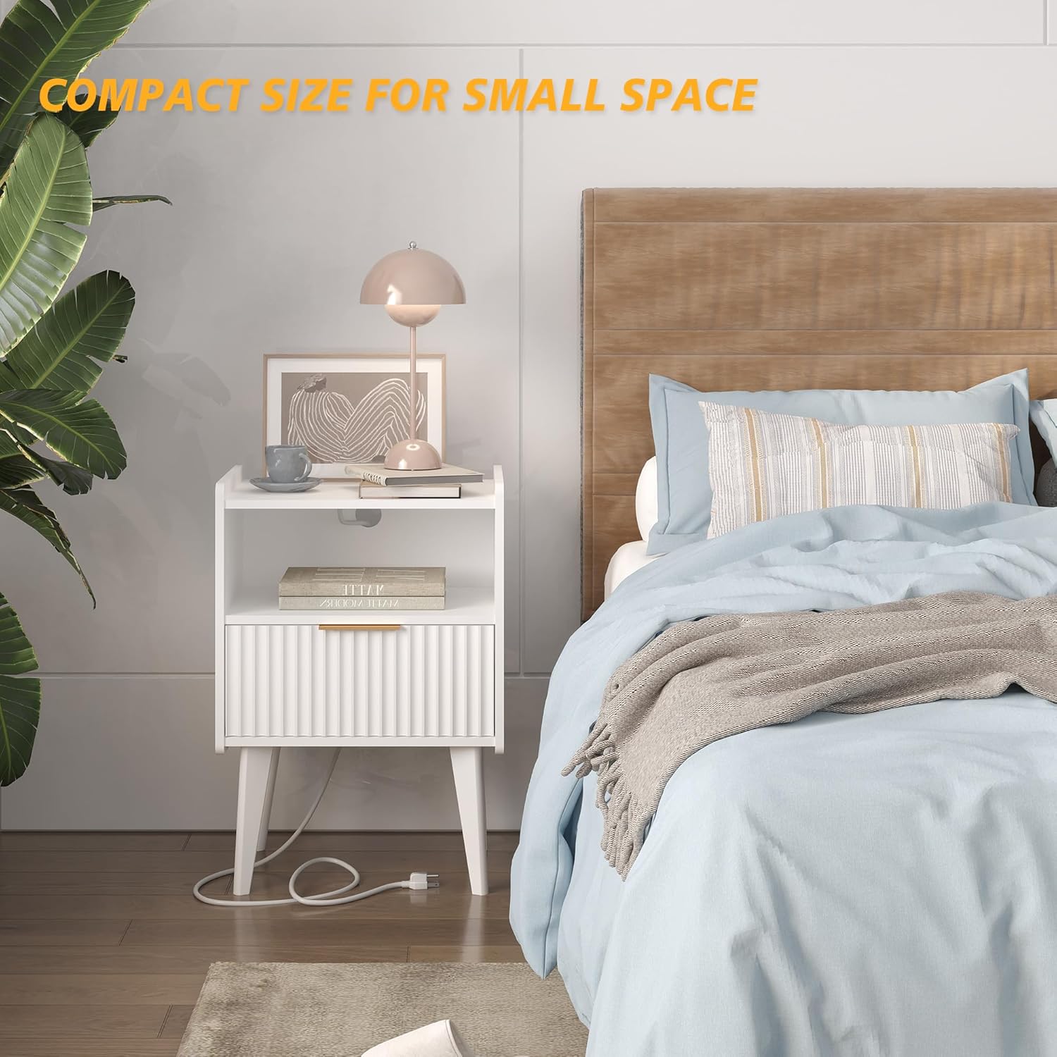 Fluted Nightstand with Charging Station, Modern Bedside Table with Drawer,White Nightstand with Solid Wood Legs, End Table,Side Table for Living Room,Bedroom White CTG57WE