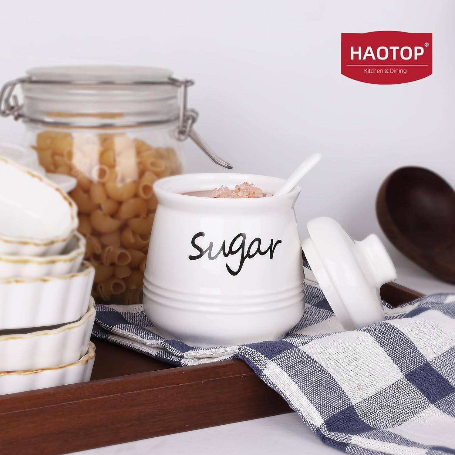 HAOTOP 12oz Sugar Bowl with Lid and Spoon,Ceramic Sugar Jar Sugar Dispenser Sugar Container Coffee Bar Accessories, Kitchen Countertop Canisters, White