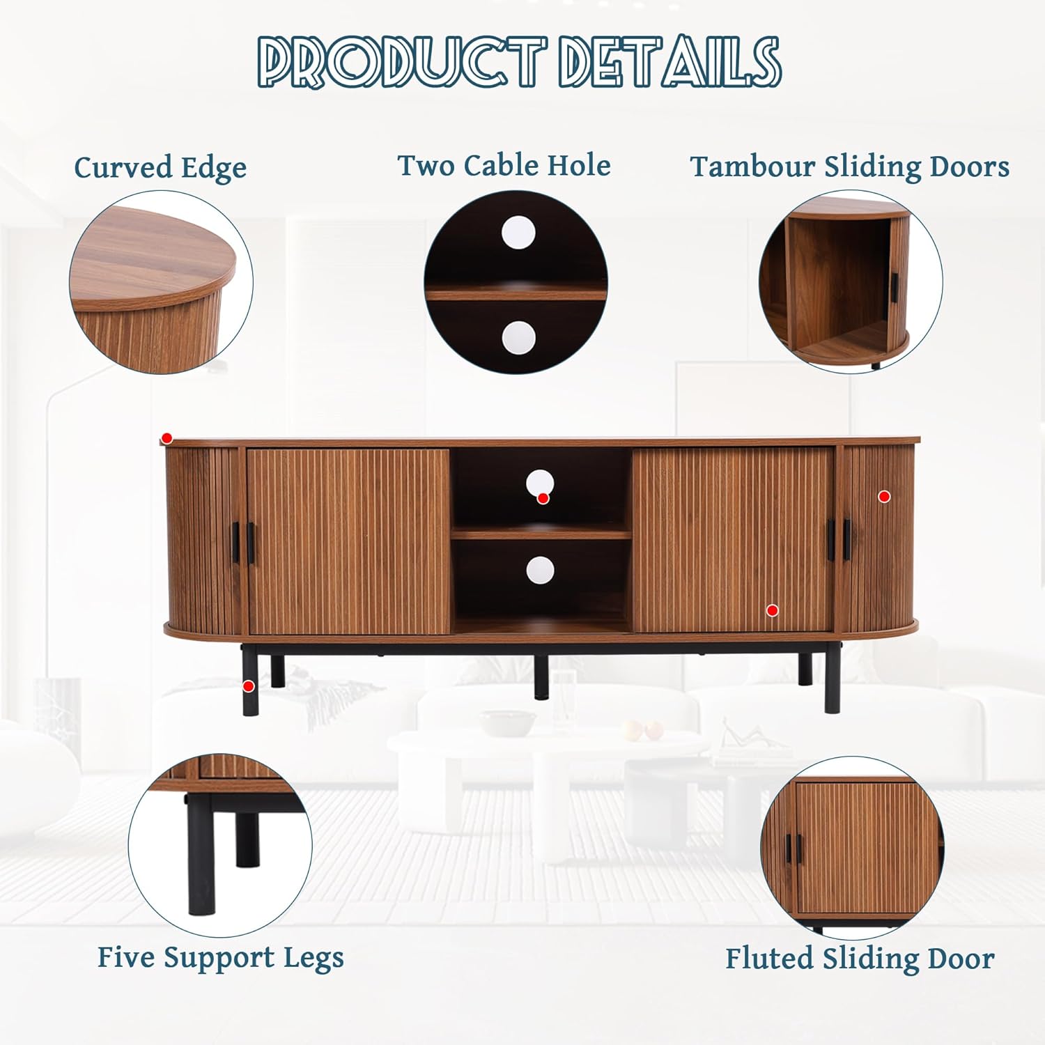 62" Tambour Door TV Stand,Wood Mid Century Modern TV Cabinet for Up to 70“ TV,Curved Edge Long TV Stand with Storage for Bedroom Living Room(Walnut, 62.2inch)
