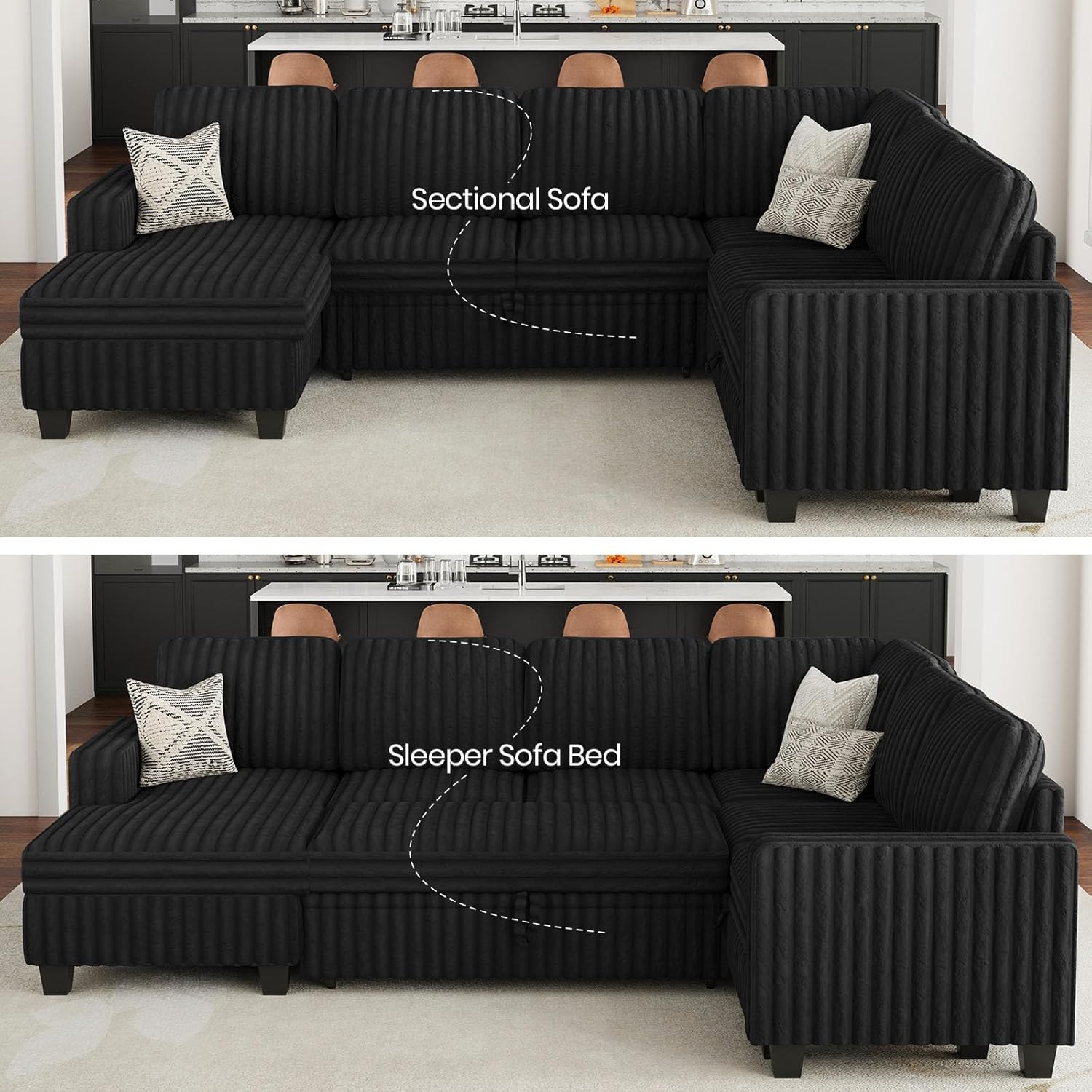 Belffin Corduroy Sleeper Sofa Bed with Storage Chaise Modular Sectional Sofa Couch with Pull Out Bed L Shaped Sectional Couches for Living Room Black Couch