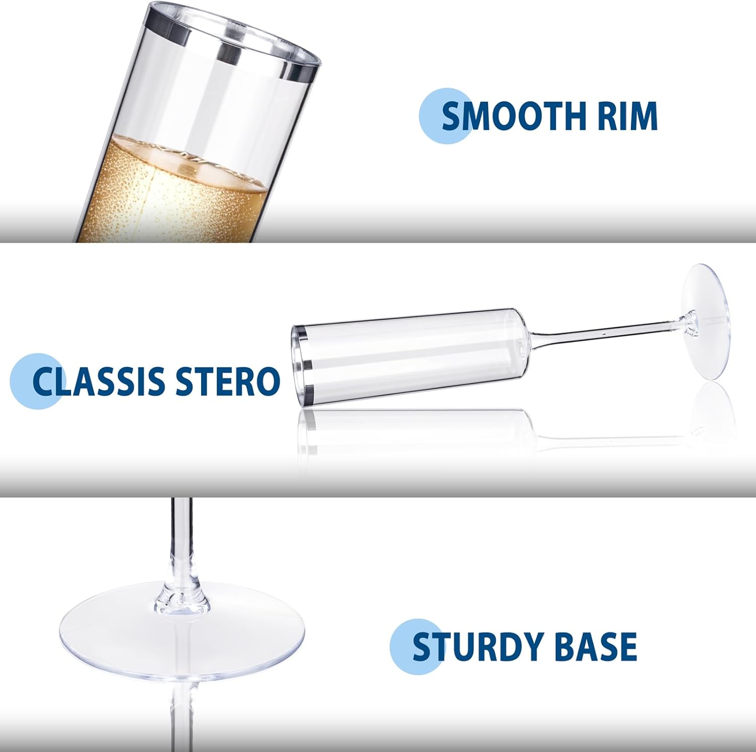 - The Perfect Gift: These plastic toasting glasses are sophisticated, glamorous and luxurious. They will make a unique gift that your family and friends are guaranteed to impress! Celebrate life's most memorable moments with a plastic disposable champagne flutes - weddings, anniversaries, mother's day, a costume reception or an engagement party that will surprise you beyond your wildest expectations.