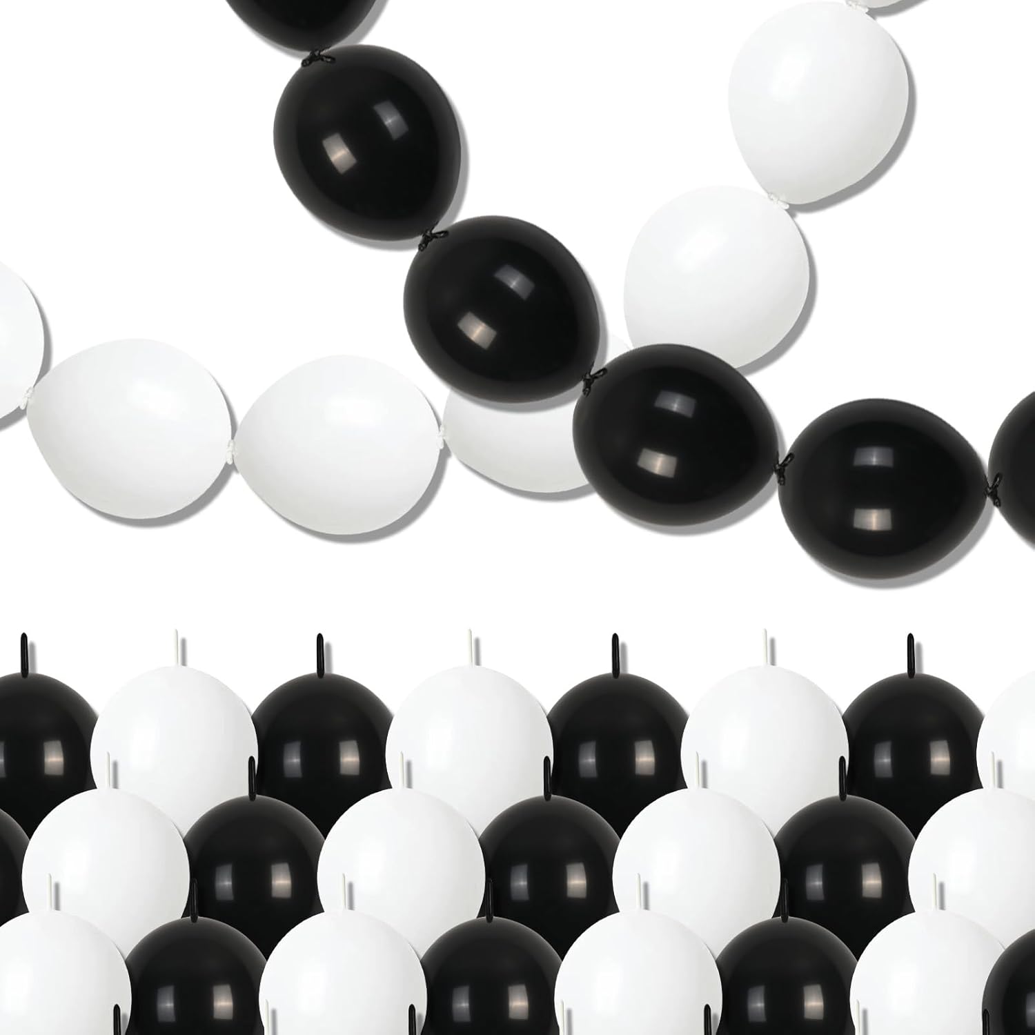 - 💫Diverse assembly - The linking balloons is an excellent choice for balloon chain decoration, balloon wall creation, and various balloon model making. It can be used for party decoration, it can be hung on the ceiling alone to form a hanging balloon chain, can be used for balcony balloon chain decoration, and can be freely matched and connected the black balloons and white balloons according to different styling needs.