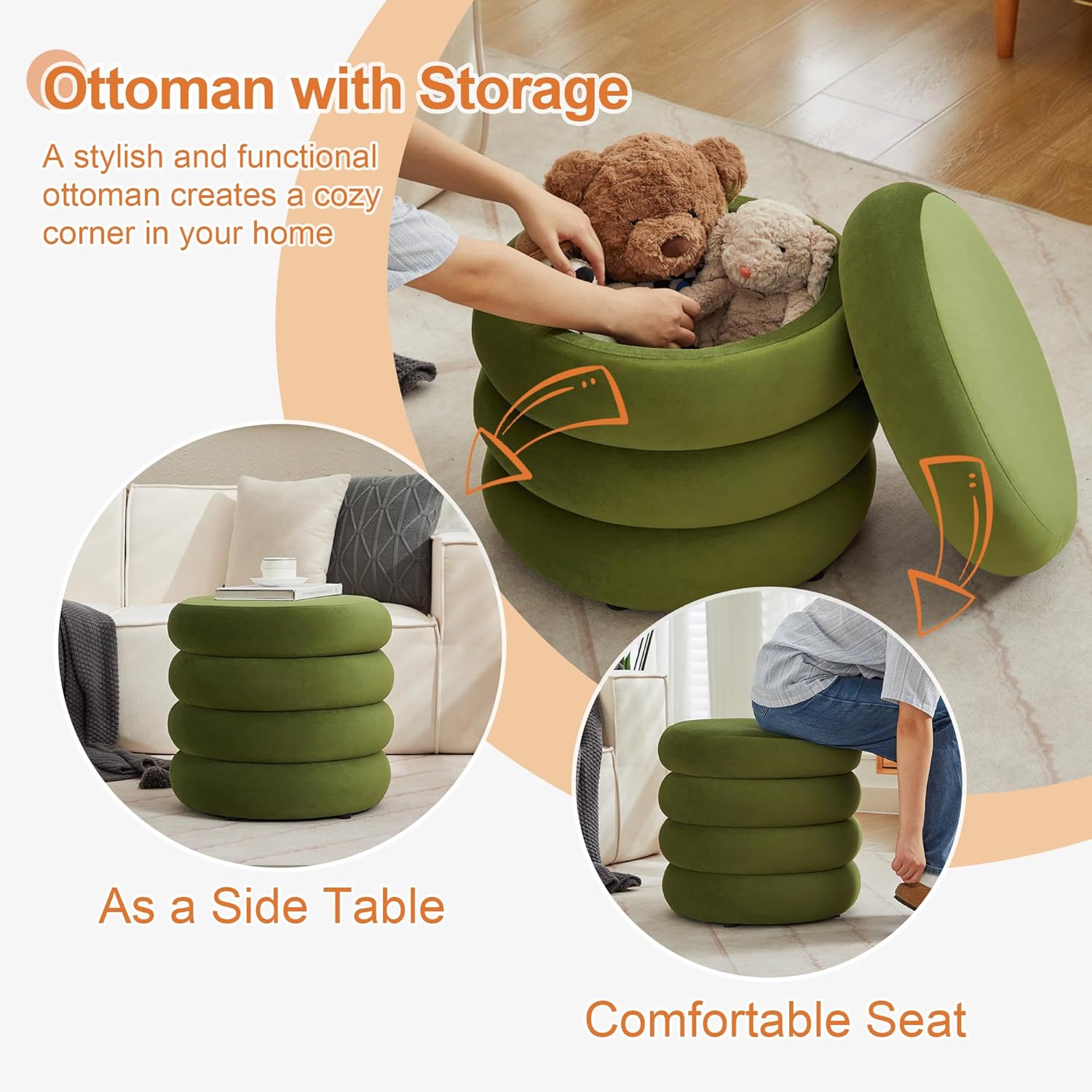 ONEVOG Round Storage Ottoman, 20" Small Ottomans Table with Removable Lid, Velvet Fabric Soft Footrest Stool for Couch, Upholstered Stuffed Circle Seat for Livingroom/Bedroom/Dorm/Vanity, Olive Green