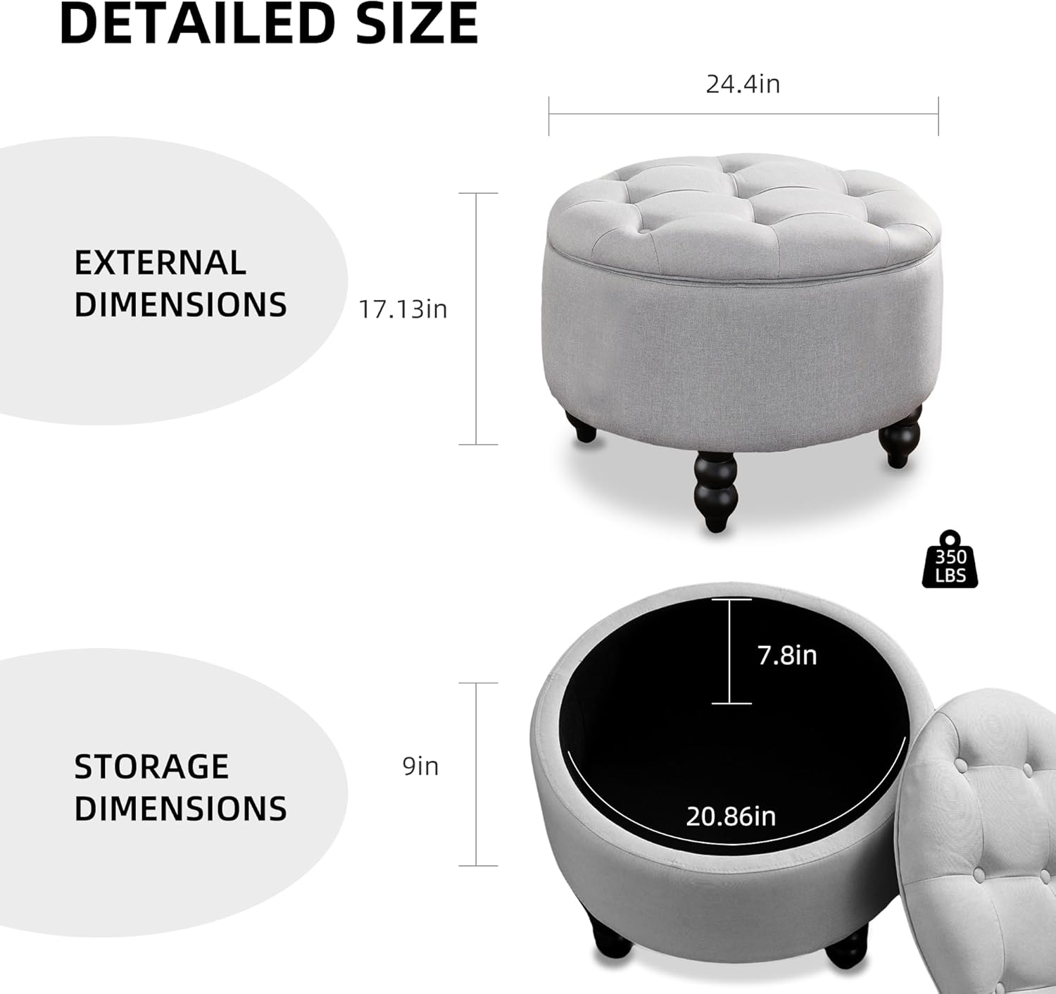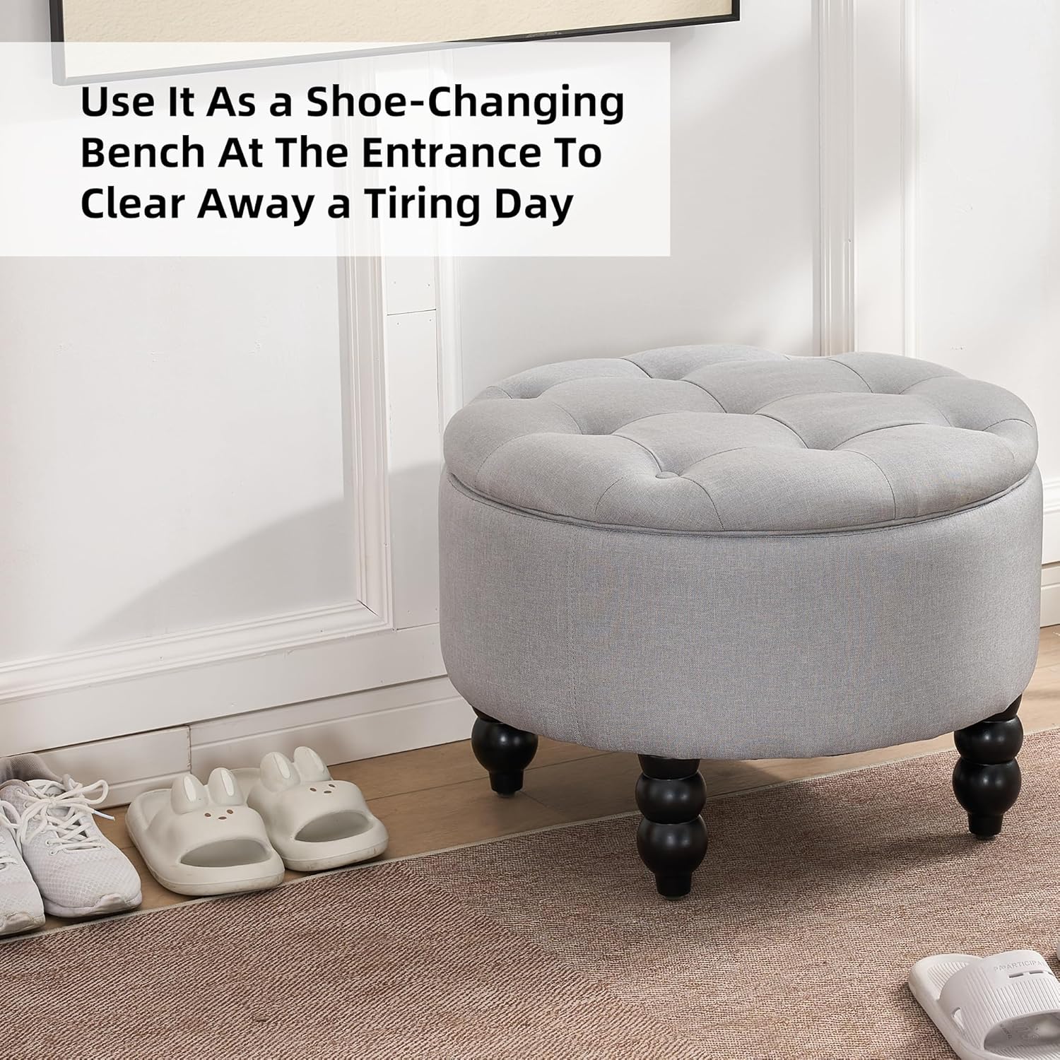 - EXQUISITE APPEARANCE: The round ottoman tufted is hand-inlaid buttons are beautiful and durable, the pure black wooden gourd-shaped legs are exquisite and unique, and the solid wood legs can bear up to 350LBS.