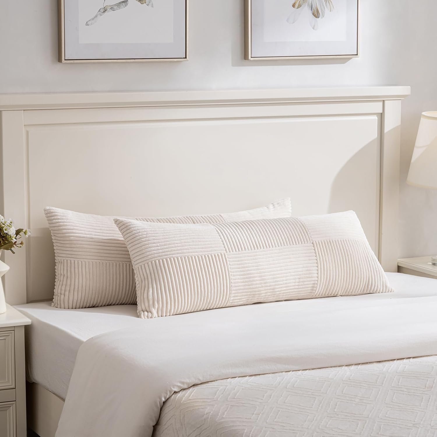 Fancy Homi Set of 2 Cream Boho Long Lumbar Body Decorative Throw Pillow Cover 14x36 Inch for Bed Couch Bedroom Bench, Soft Patchwork Corduroy Textured Pillow Case, Rustic Farmhouse Room Décor