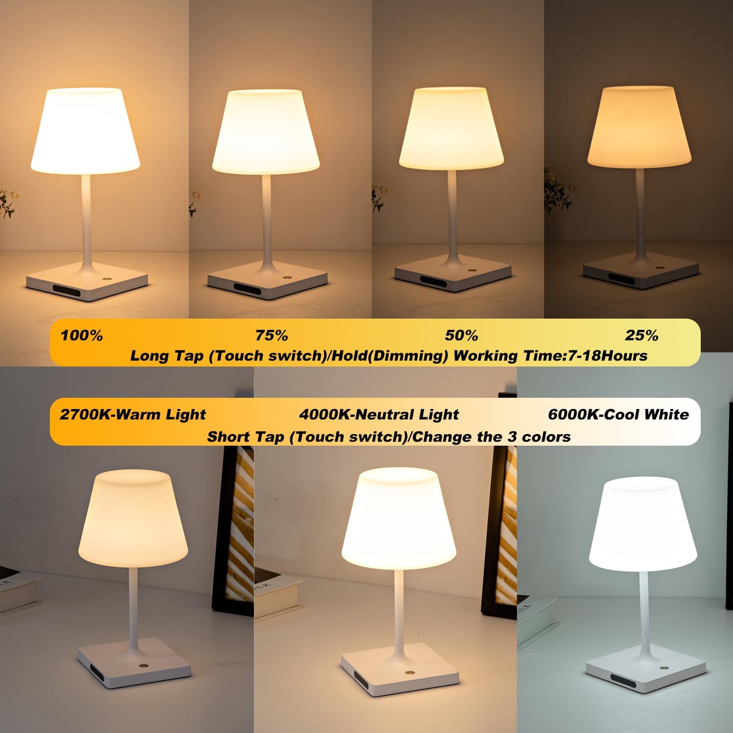 - Cordless table lamps outdoor :The battery operated table lamp with rechargeable battery :Full Charged around 5Hours,Working Time 7-18Hours after full charged(Depend on brightness)