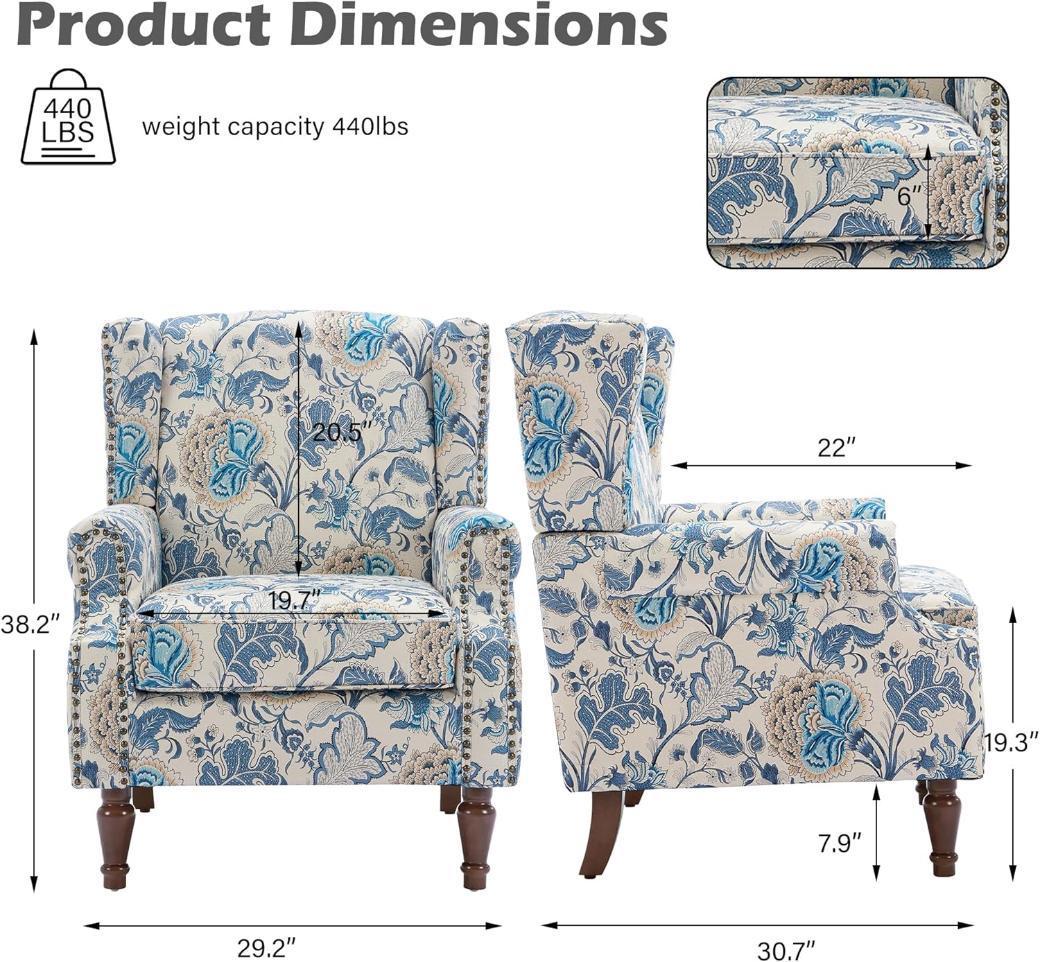UIXE High Back Floral Accent Chairs Set of 2, Upholstered Armchair in Fabric, Retro Printed Wingback Arm Chair for Living Room, Nailhead Trim Single Sofa Bedroom Reading Seat - Boho Blue