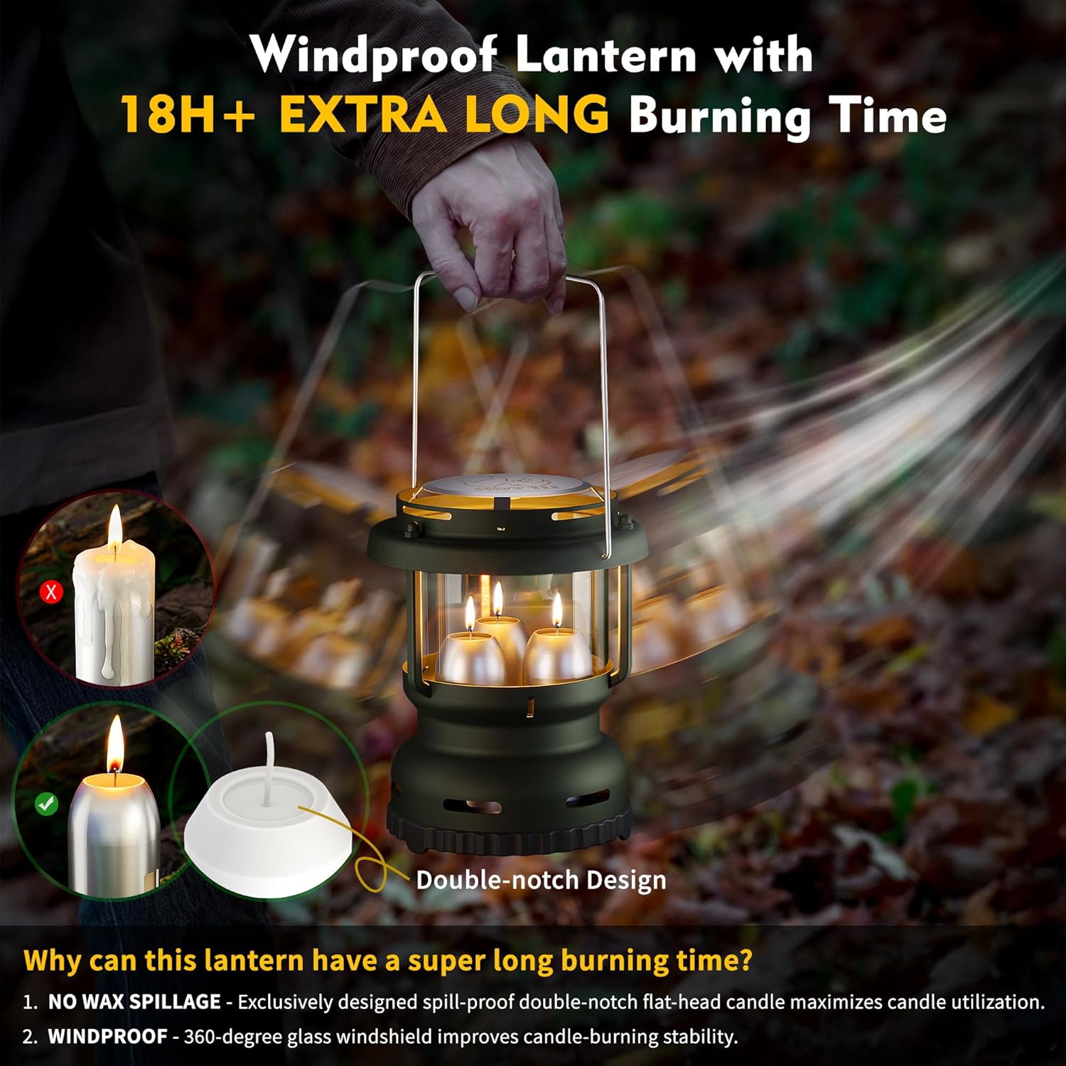 3-Wick Emergency Candle Lantern for Power Outages [18H+ Burning Time] Vintage Decorative Candle Lantern for Real Candles, Outdoor Portable Camping Survival Lighting [7.1"*5.7" - Forest Green]