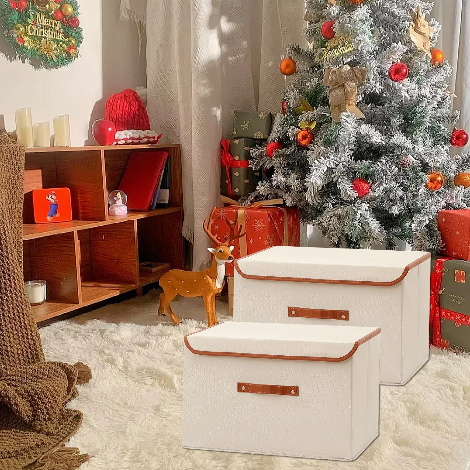 Tuza 2 Pack Large Fabric Storage Bins with Lids, Foldable Storage Boxes with Lids for Organizing, Decorative Storage Boxes with Handles for Home, Bedroom, Closet, Office(Khaki, Extra Large)