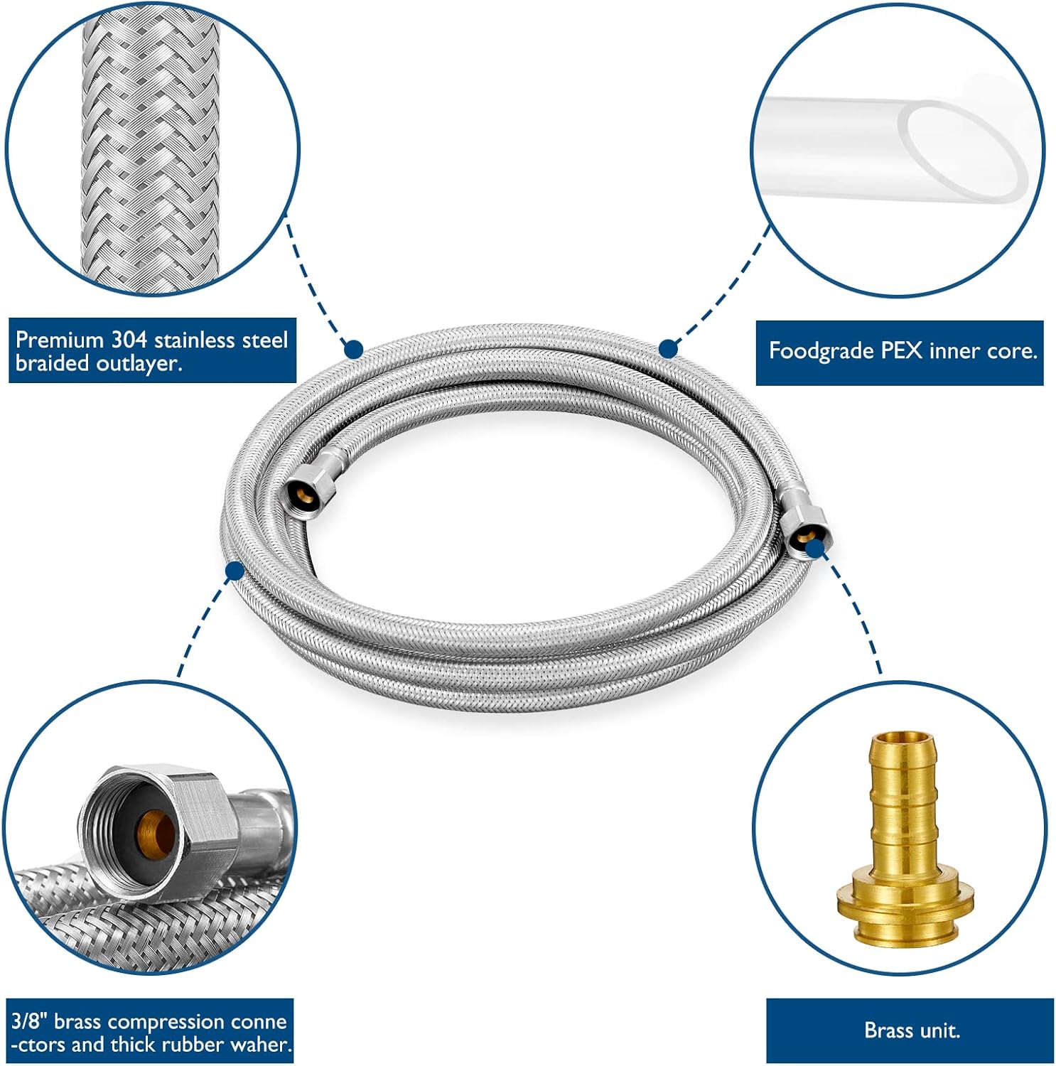 - 【Prime quality 】:The water line outer layer is wrapped with superior grade 304 stainless steel braided wire,the brass tee stop valve and elbows are single piece brass construction;So all the parts are extremely safe and durable,there is no need to consider replacement for several years.