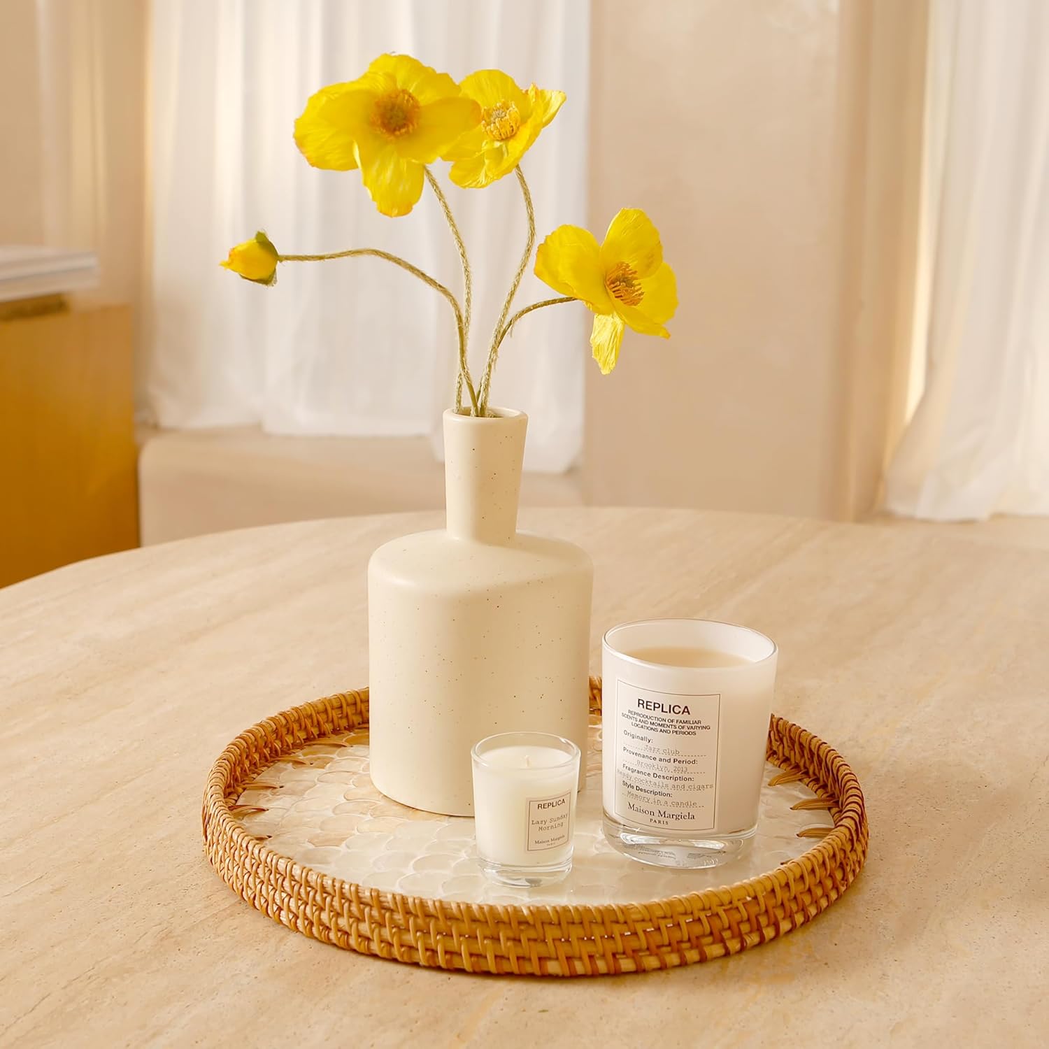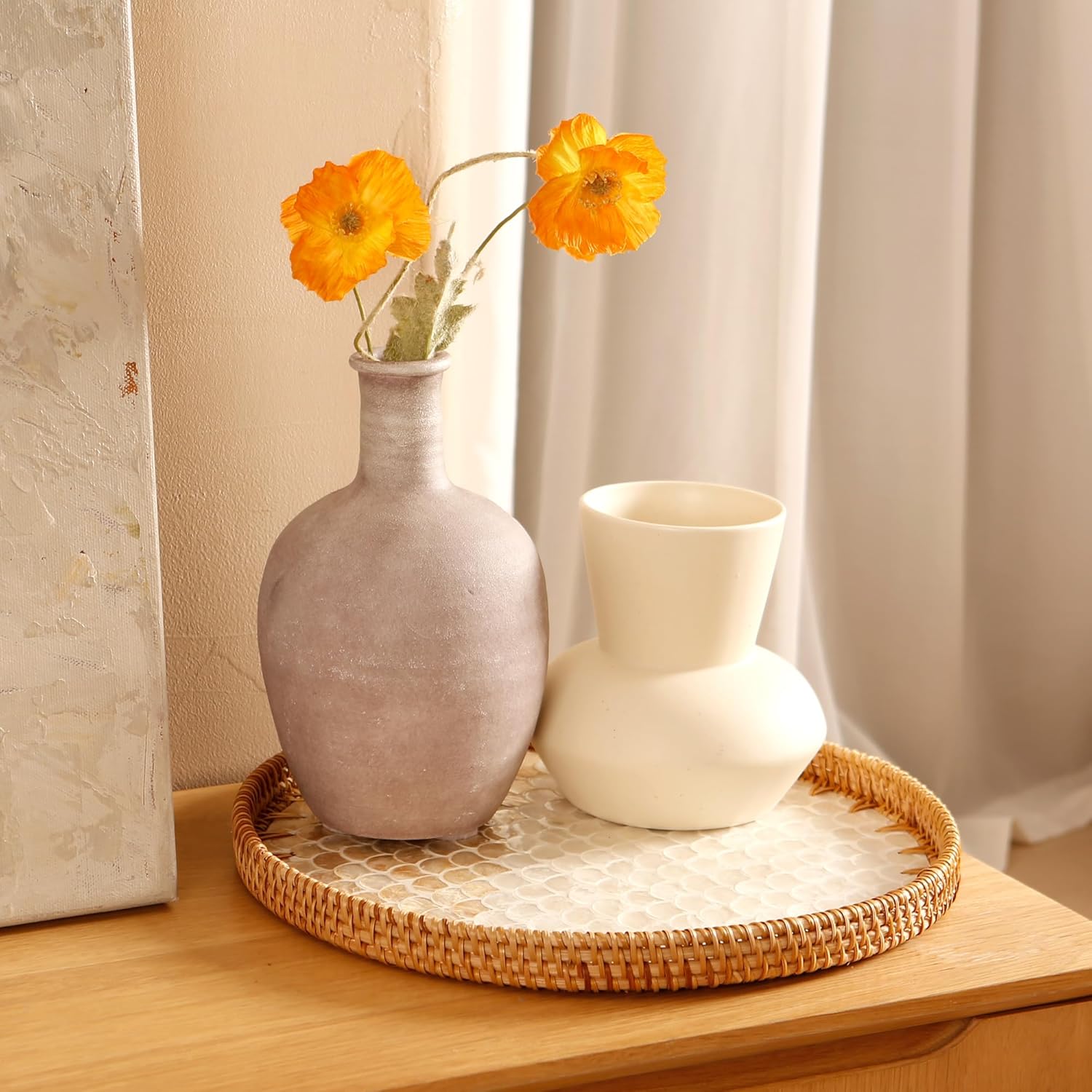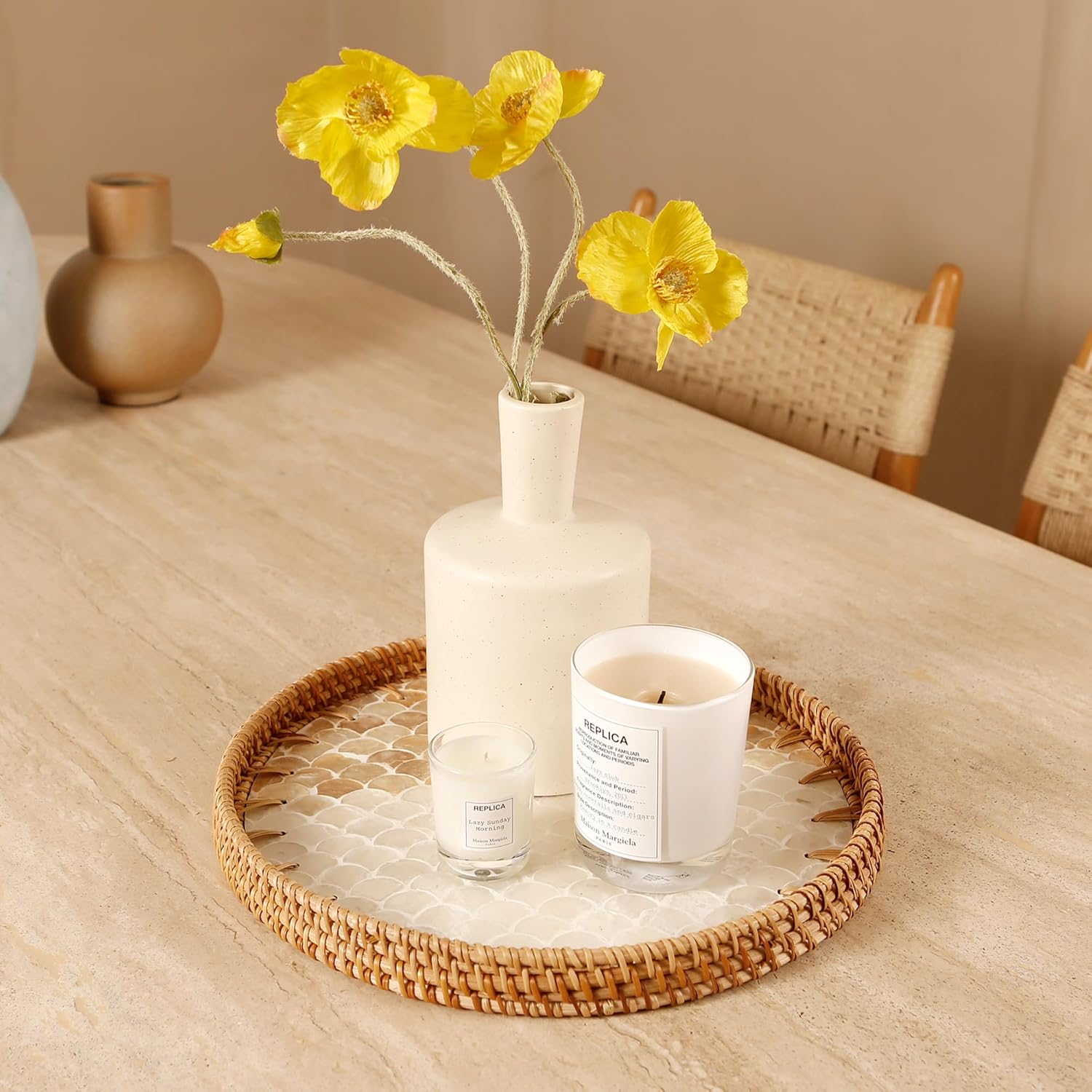 Round Rattan Tray with Mother of Pearl Inlay & Wooden Base - Decorative Wicker Serving Tray for Coffee/Bread/Fruits, Food Storage & Display - Multipurpose Home Decor (L,Fish Scales)