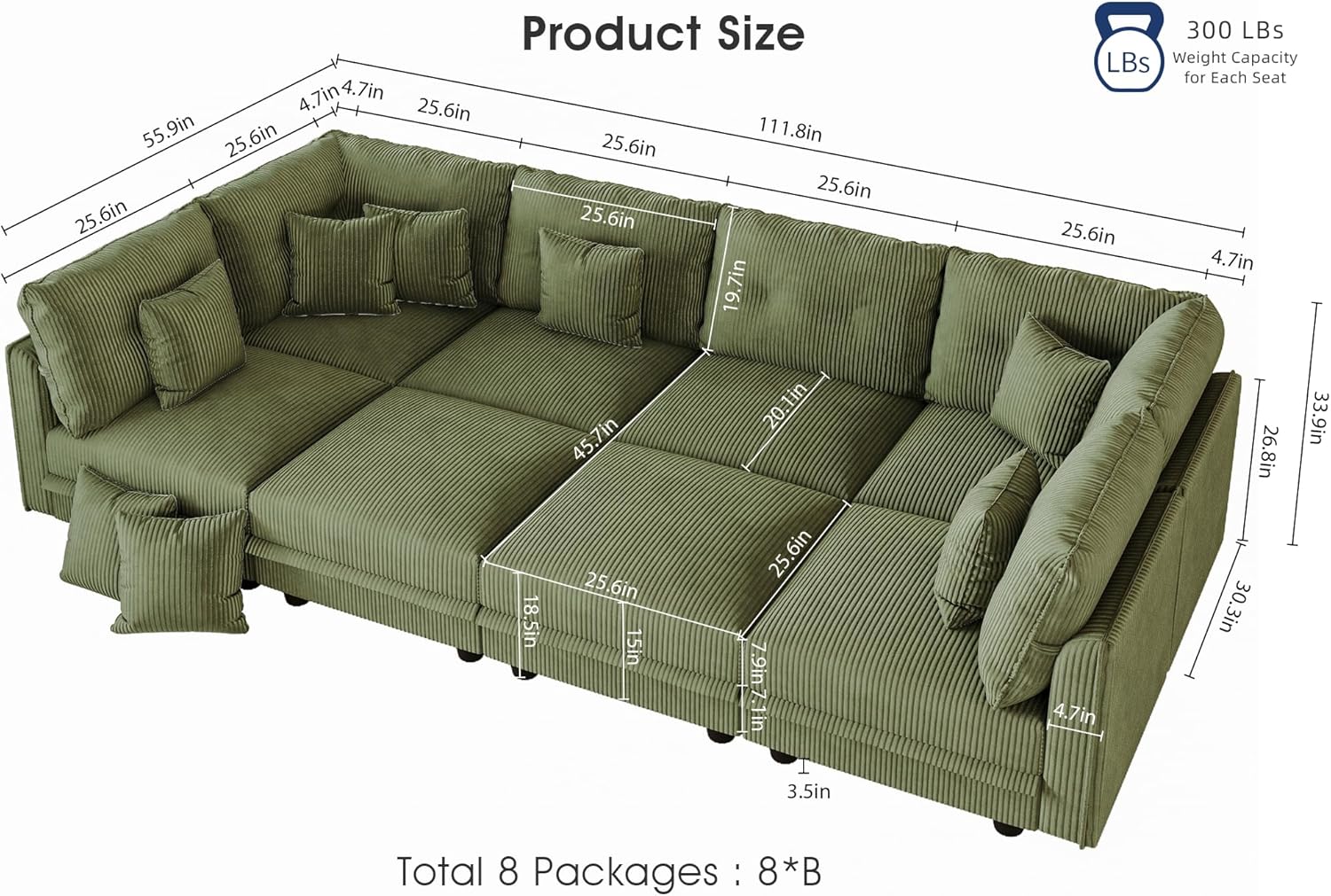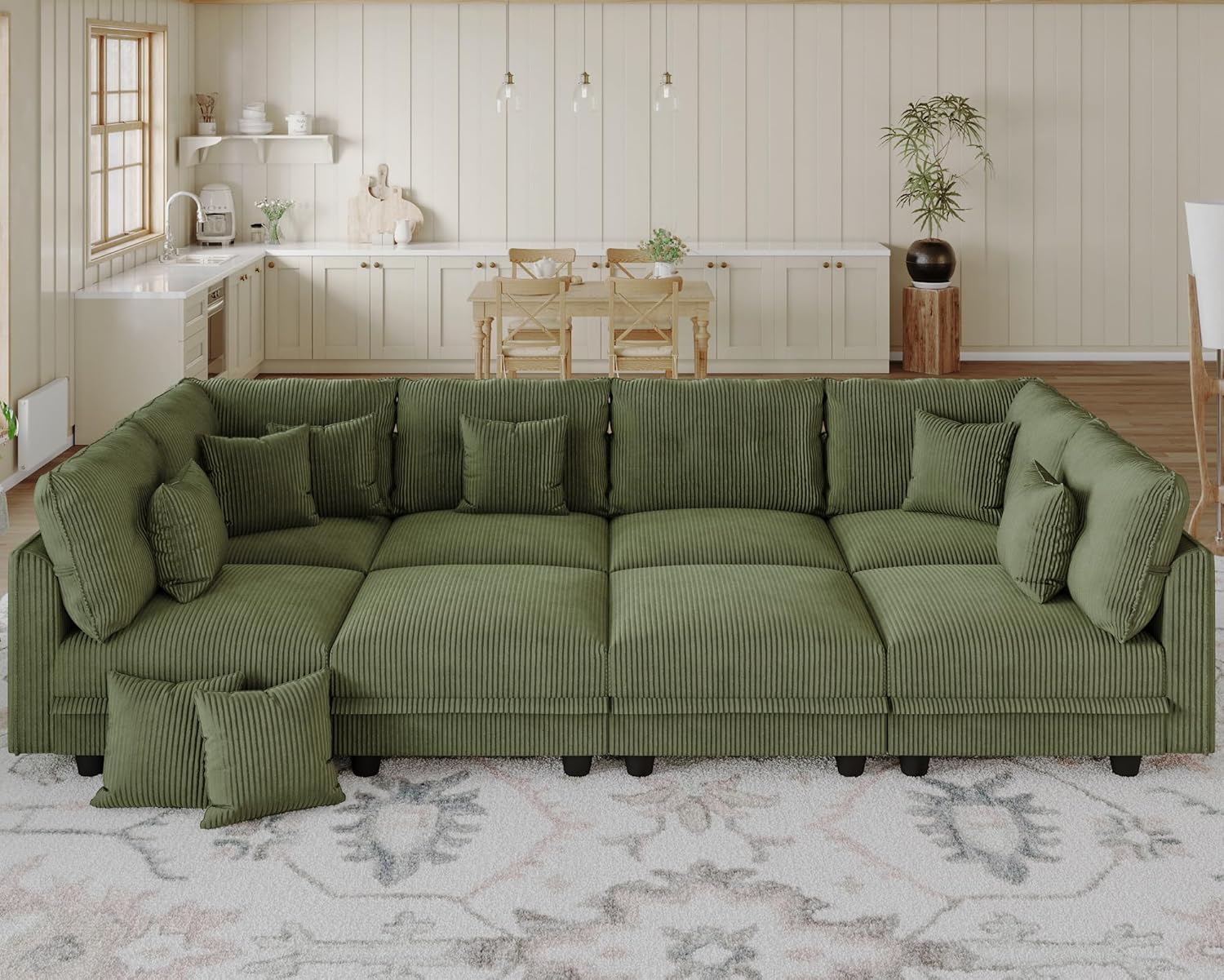 LLappuil Modular Sectional Sofa with Storage Seats, Corduroy Convertible Modular U Shaped Sectional Couch for Living Room, 8 Seat Oversized Sofa with 8 Back Cushion 8 Throw Pillow, Green