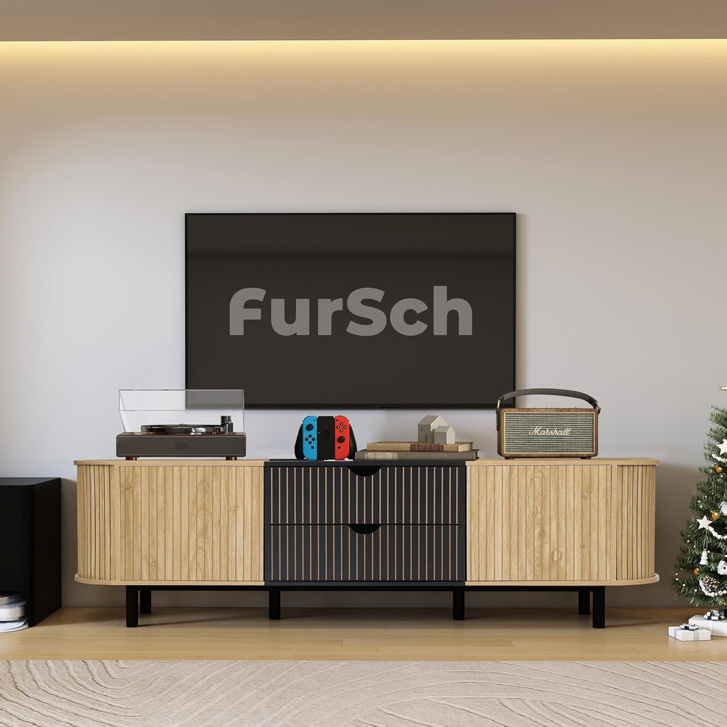 - Elegant Fluted Design: This TV stand showcases a captivating slatted roller shutter sliding door design, perfectly paired with a sleek curved profile. The elegant tambour doors not only enhance the aesthetic appeal but also allow for seamless access to your media devices while adding a modern touch to any living space.