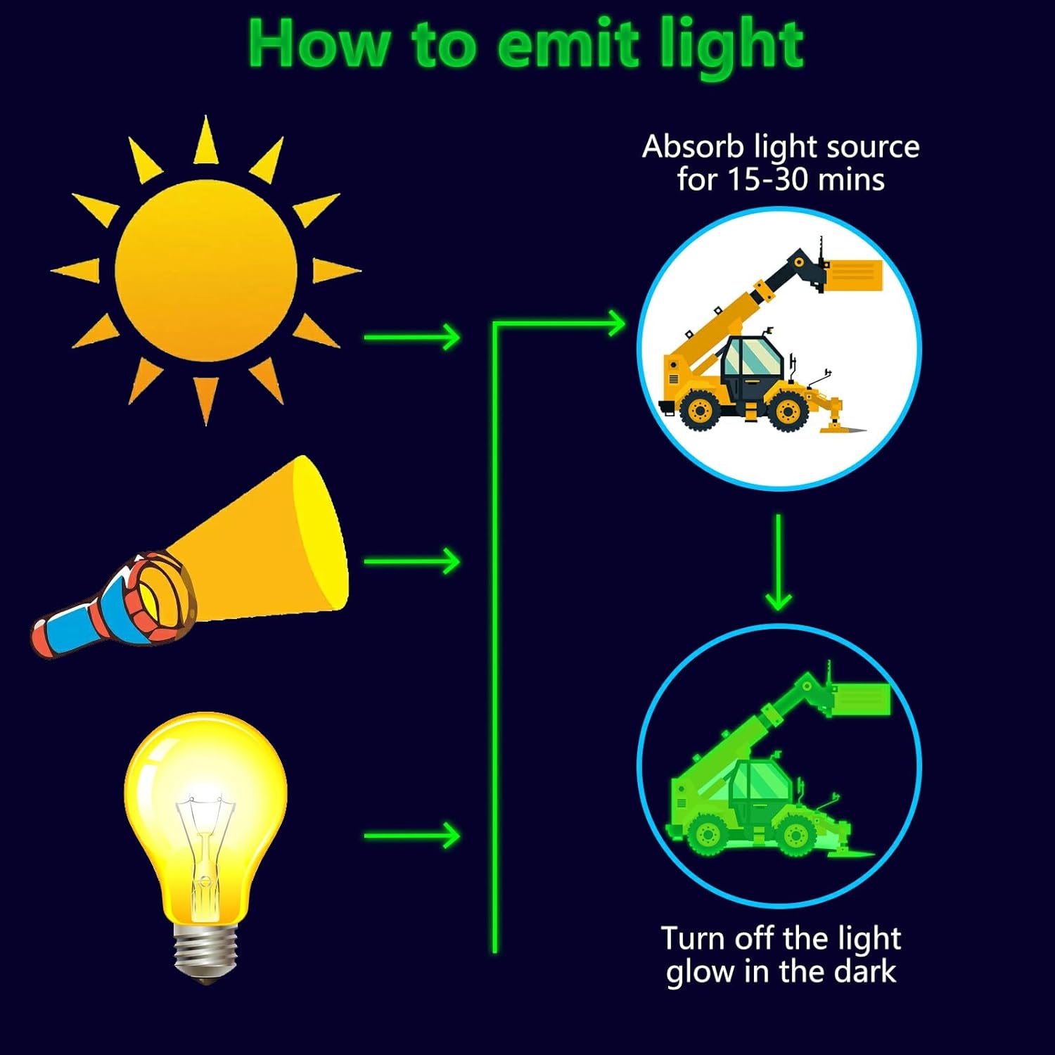 - ⦠Glow Construction Wall Decals: These glow wall decals for ceiling are made of quality luminous material,they will glow brightly when absorb enough light during the day. You just need to put it under lamplight flashlight ,room light or sunshine for 15 minutes, it will keep glowing for 8-10 hours with a gentle green fluorescent light. Please ensure the light shines on the decals without obstruction, the longer it takes to absorb light, then to light up for up to longer.