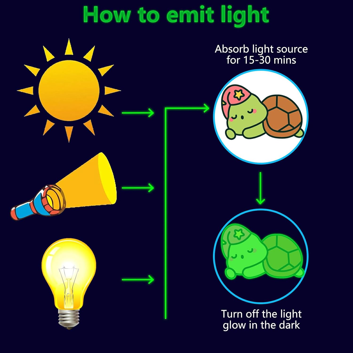 - ⦠Glow Turtles Wall Decals: These glow wall decals for ceiling are made of quality luminous material,they will glow brightly when absorb enough light during the day. You just need to put it under lamplight flashlight ,room light or sunshine for 15 minutes, it will keep glowing for 8-10 hours with a gentle green fluorescent light. Please ensure the light shines on the decals without obstruction, the longer it takes to absorb light, then to light up for up to longer.