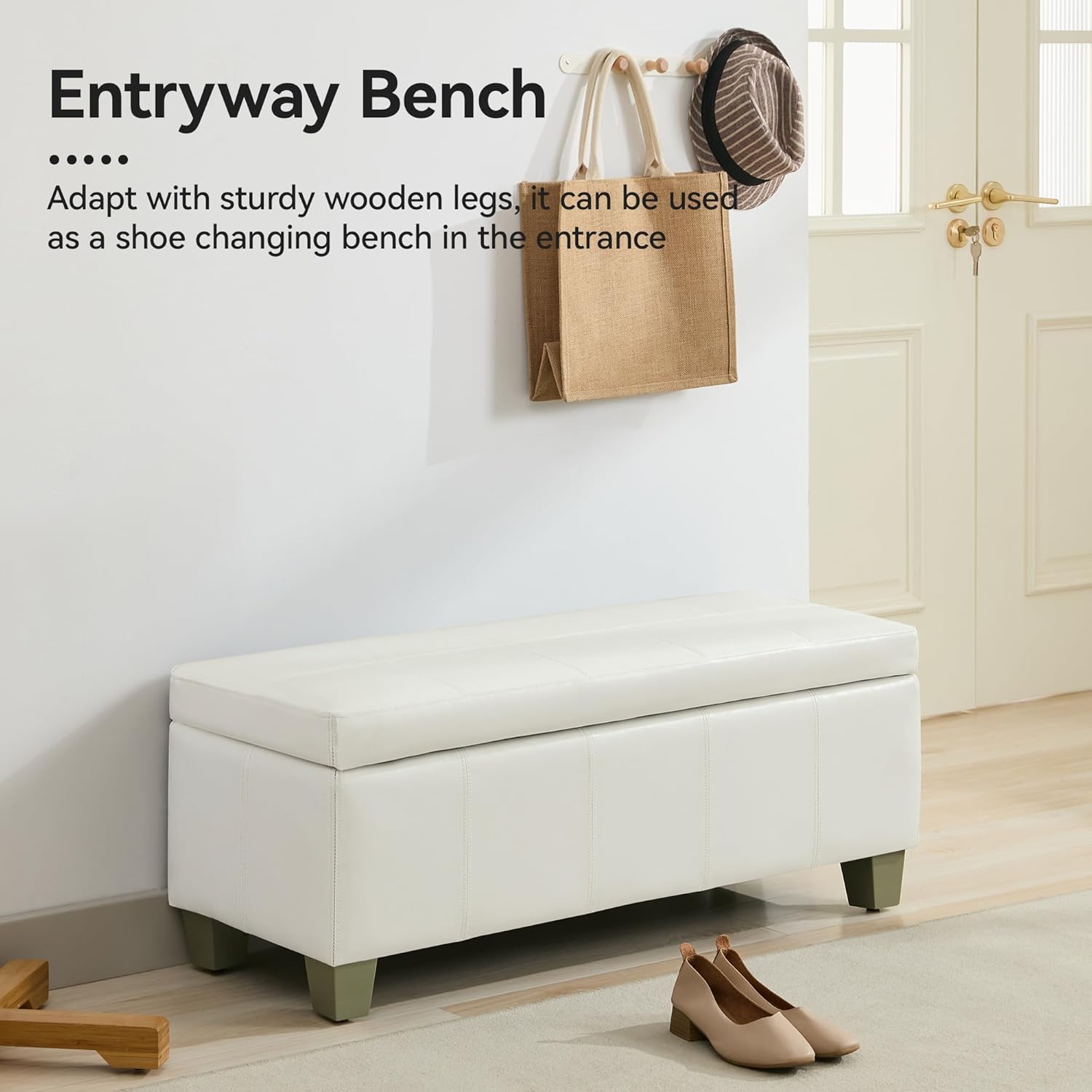 41" Faux Leather Storage Ottoman, Stitch Tufted Rectangle Upholstered End of Bed Storage Bench, Entryway Large Couch Ottoman with Wooden Legs,White