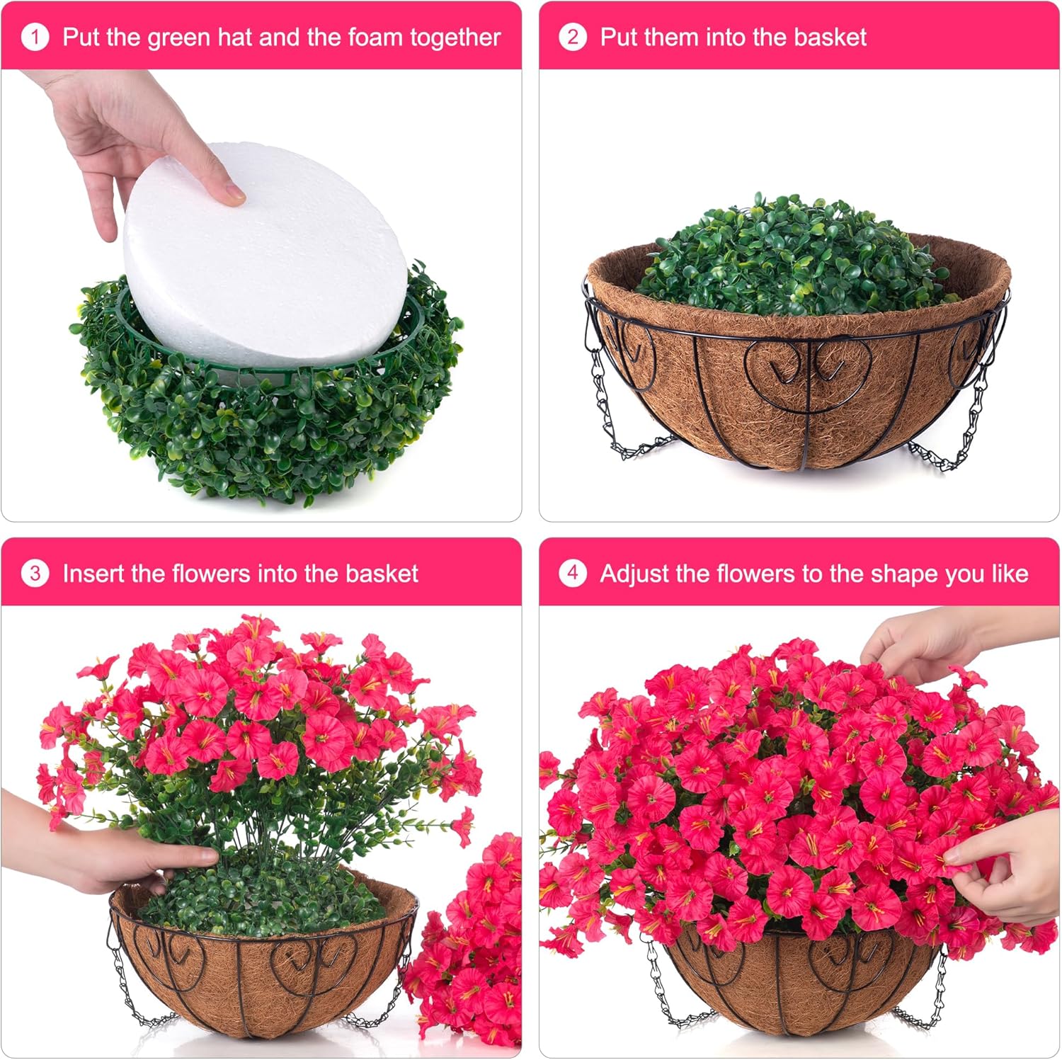 - 🟢 Easy Installation: The size after assembly is approximately 19.6" x 19.6" x 20.5 "(LxWxH); The basket measures 12" x 12" x 5.5"(LxWxH) and the chain length is 15 inches. Flower baskets are very easy to assemble. You just need to arrange the flowers according to your preference.