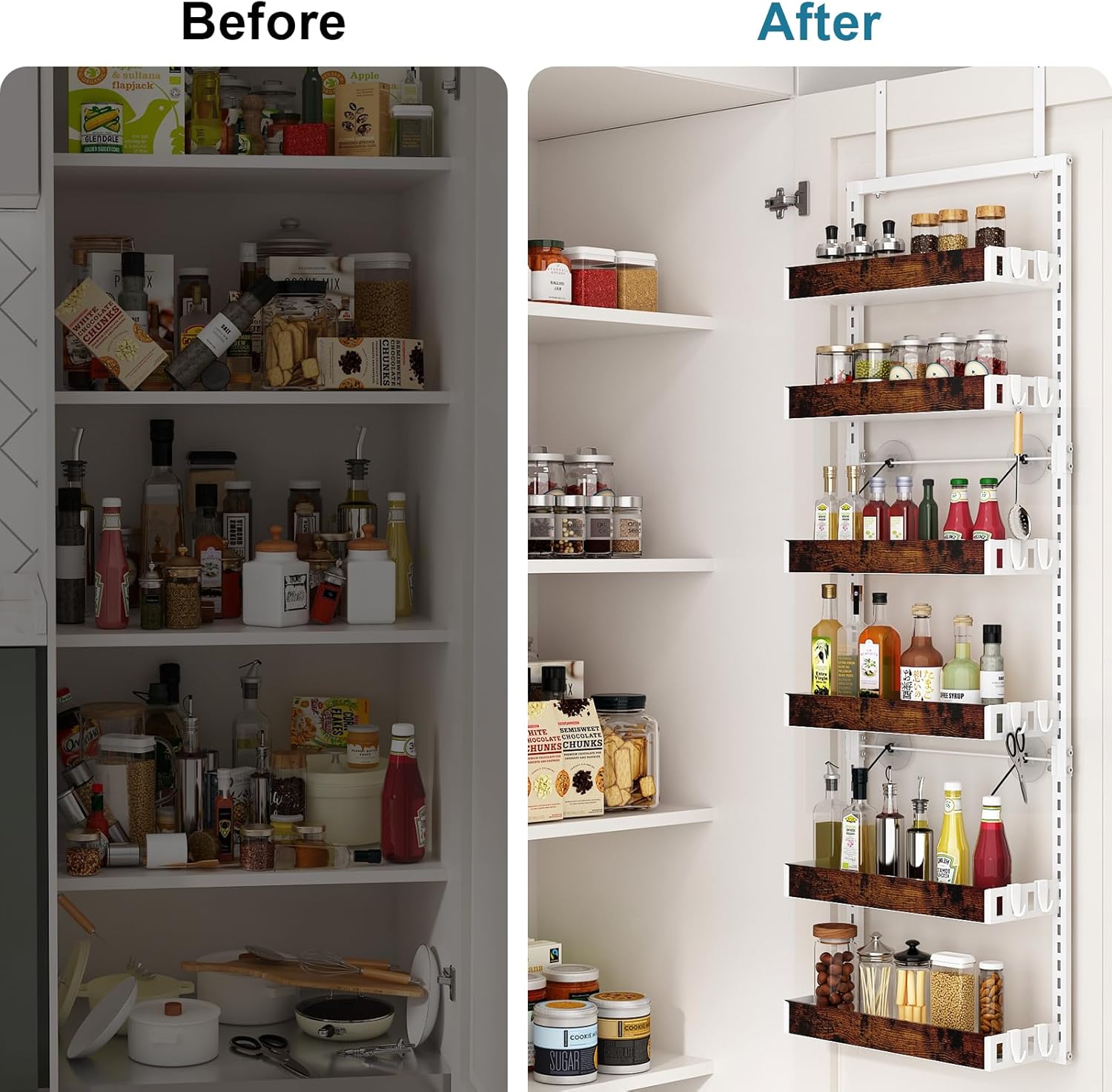 - ăLarge Capacity and Stable Structureă6-layer large capacity can be reasonable partition to place your things.Strong load-bearing,long-lasting and durable.Over The Door Pantry Organizer is made of high quality metal materials,with enhanced load capacity,robustness,rust resistance and stability