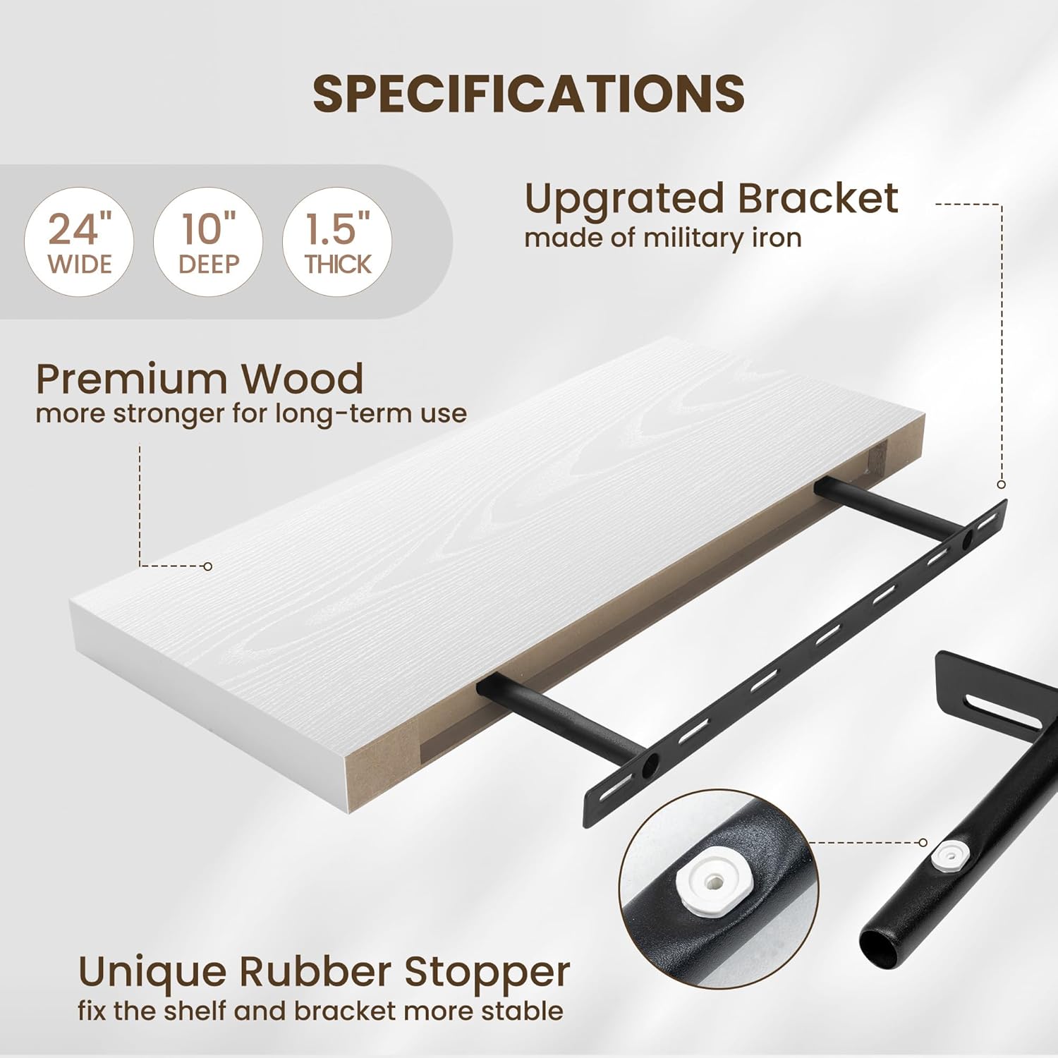 Fun Memories 24 Inch Floating Shelves Wall Mounted, 10 Inch Deep Wall Shelves, 24 x 10 Floating Shelf for Living Room Bathroom Bedroom, White, Set of 2