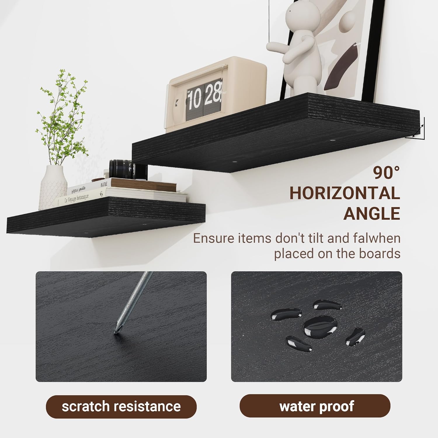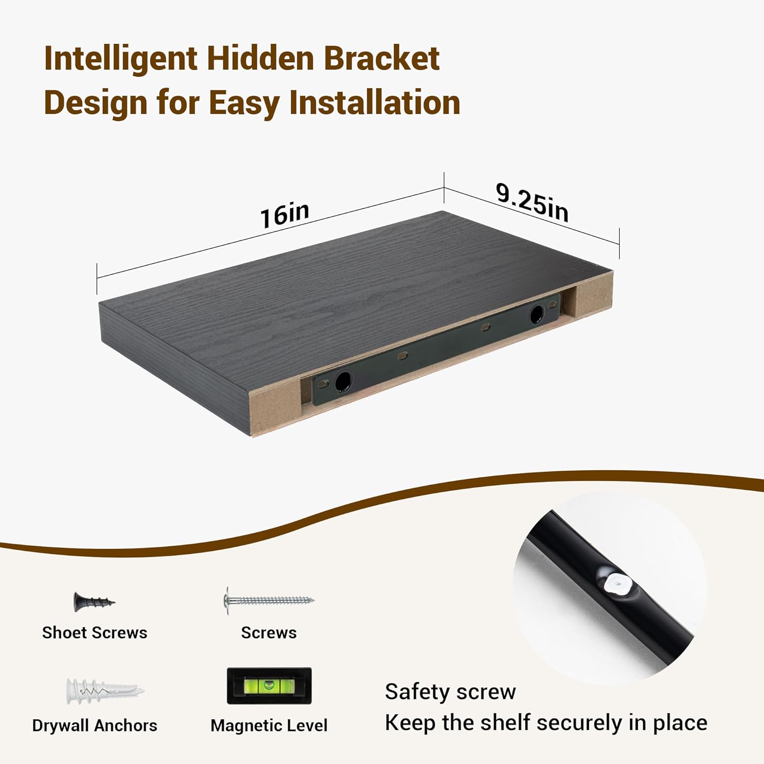 - ăPremium Quality ConstructionăCrafted from high-grade engineered wood with an invisible one-piece bracket, these floating shelves offer a robust and sleek design. The rustic wooden grain finish not only adds a touch of elegance but also infuses warmth into any room, making them a perfect fit for both modern and traditional interiors.