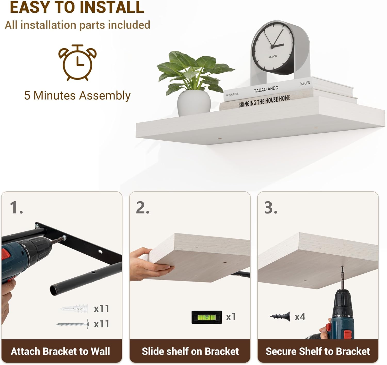 - ăEasy InstallationăDesigned with user convenience in mind, these shelves come with all necessary mounting hardware and clear instructions. You can have them up and ready to use in less than 5 minutes. Plus, our customer service is always ready to assist with any queries or concerns, ensuring a hassle-free experience