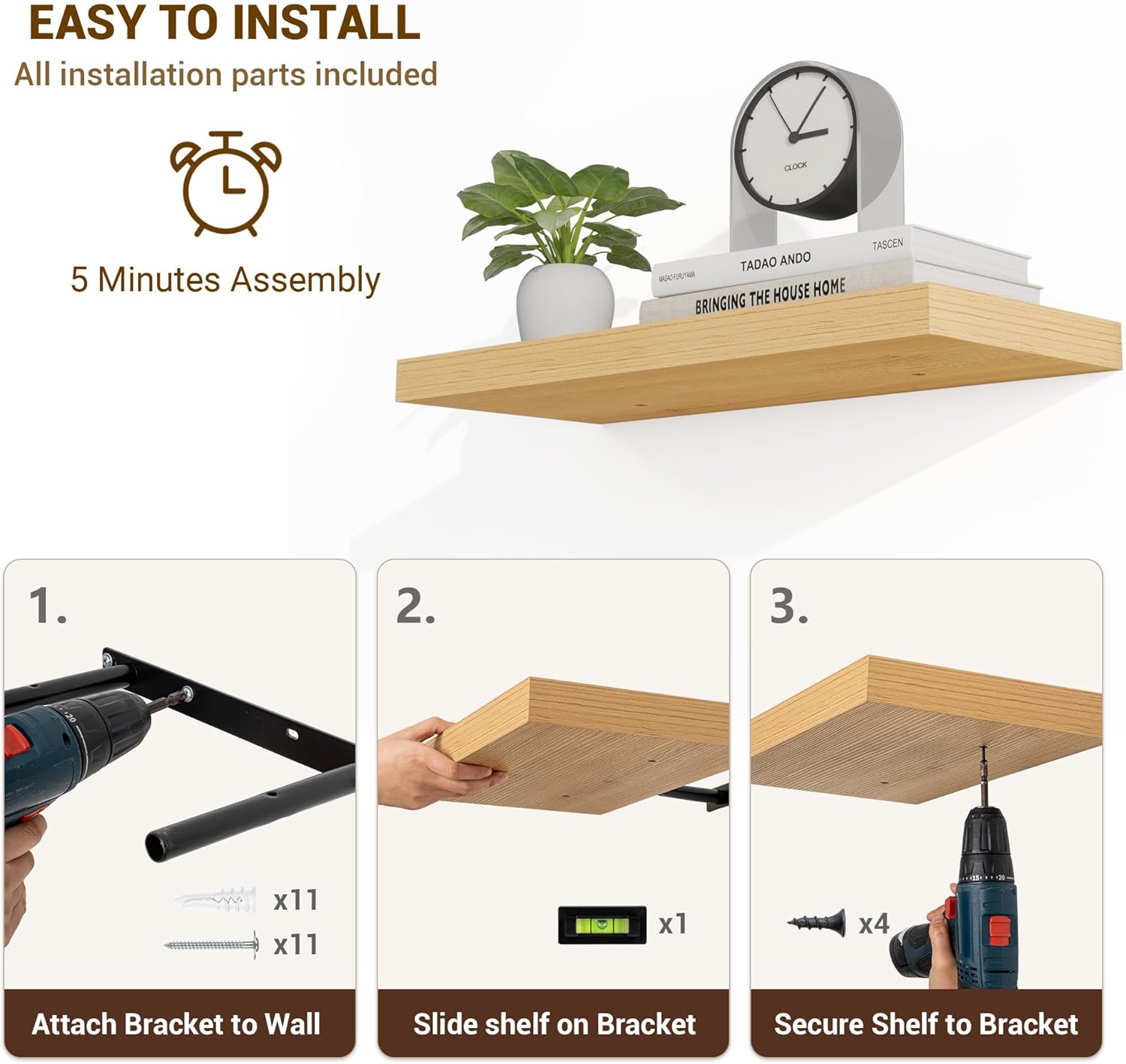 - ăEasy InstallationăDesigned with user convenience in mind, these shelves come with all necessary mounting hardware and clear instructions. You can have them up and ready to use in less than 5 minutes. Plus, our customer service is always ready to assist with any queries or concerns, ensuring a hassle-free experience