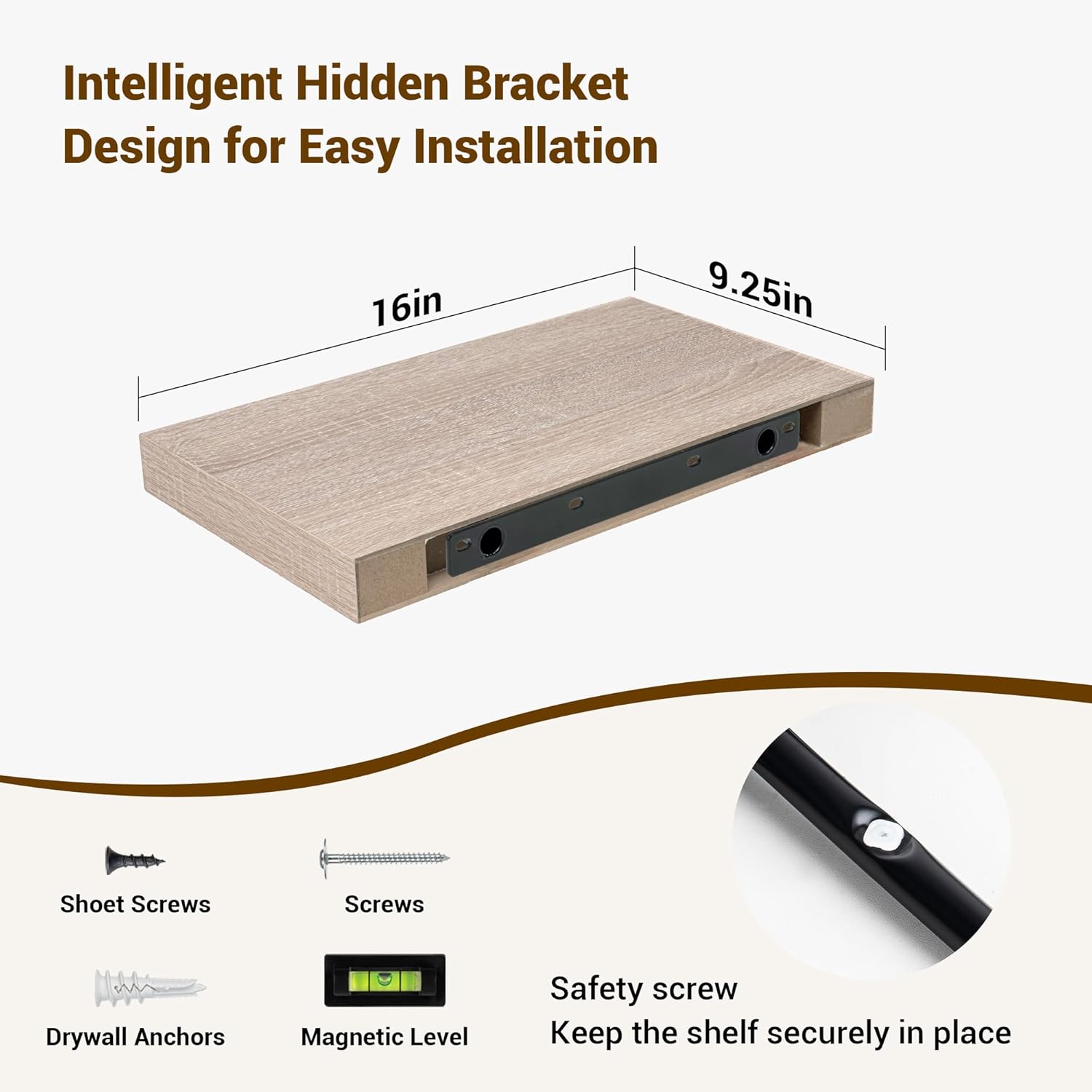 16 Inch Floating Shelves, 3D Textured Wood Grain, 16"x9.25"x1.5" Inch Deep Floating Shelves for Wall, Wooden Shelves for Bathroom, Bedroom, Living Room, Vintage White Oak