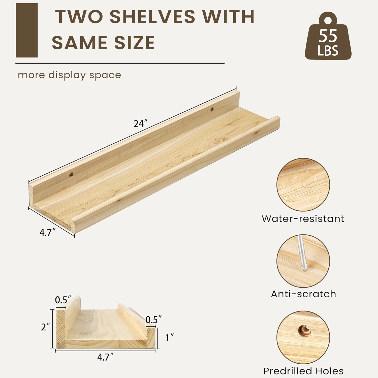 Floating Shelves for Wall, Picture Ledge Shelf 24 Inch Solid Wood Set of 2, Rustic Wall Shelves with Lip, Kids Bookshelf, Photo & Picture Live Edge Floating Shelves for Bedroom, Living Room, Kitchen