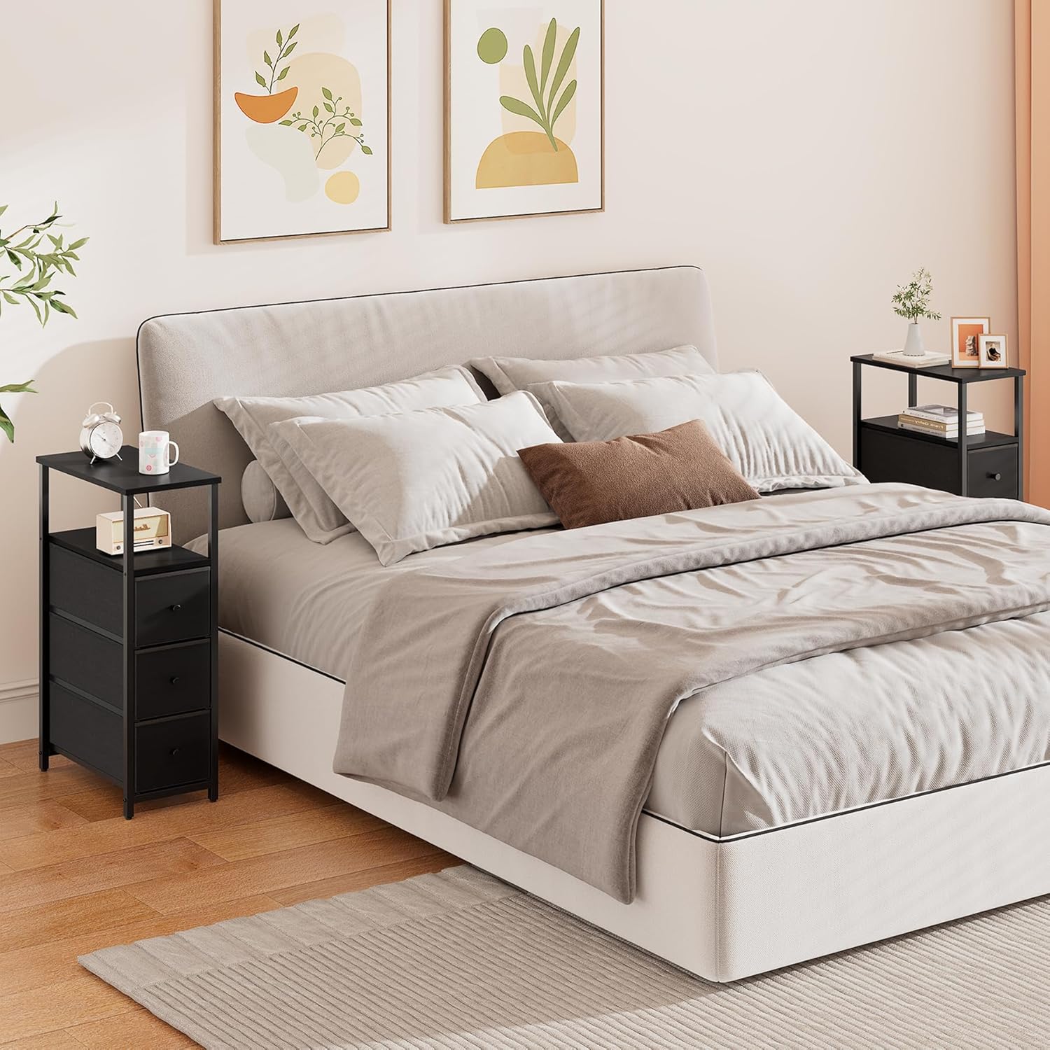 TUTOTAK Narrow Night Stand, Slim End Table, Tall Side Table with 3 Fabric Drawer, Small Bedside Table with Storage, Set of 2, for Living Room, Bedroom, Black TB01BK072