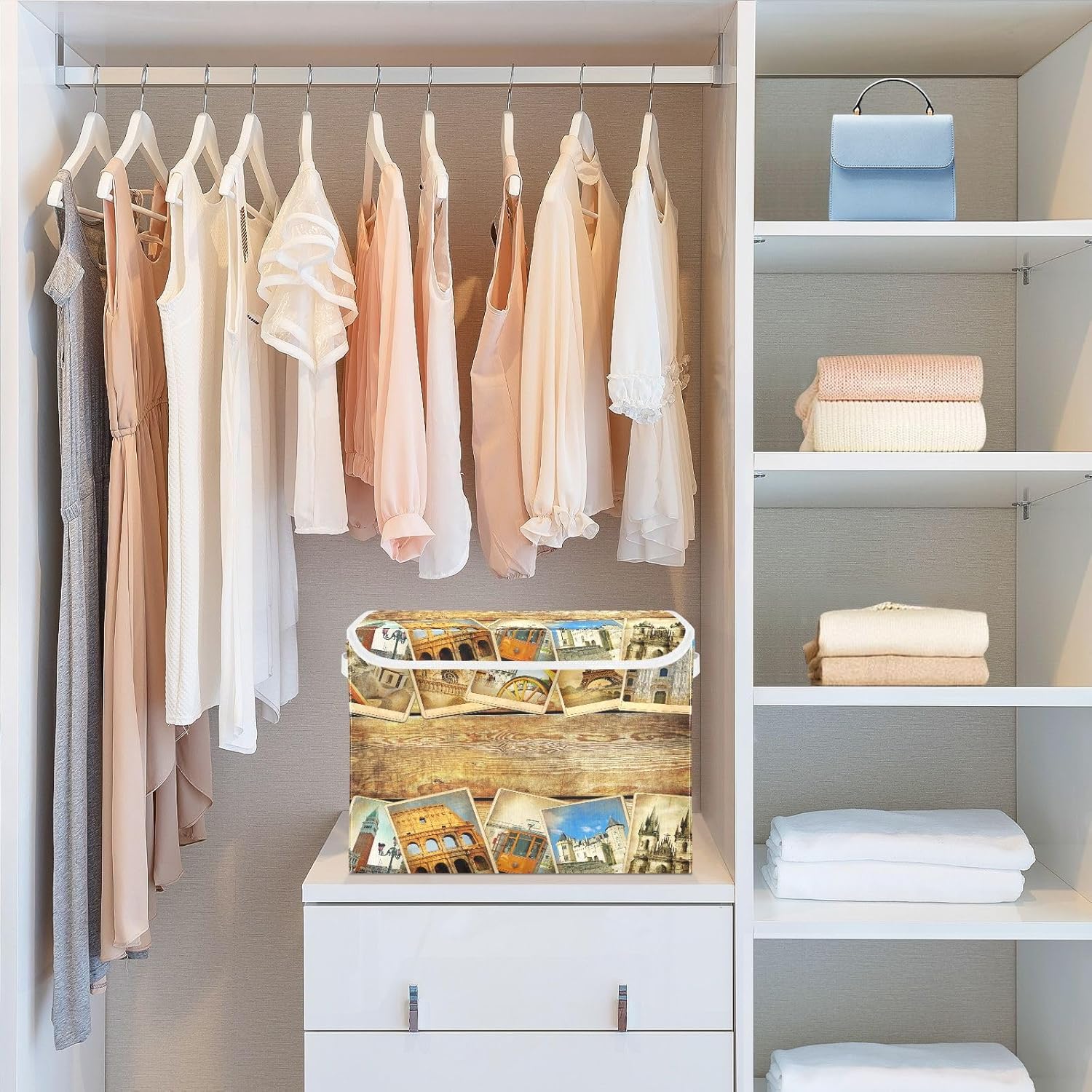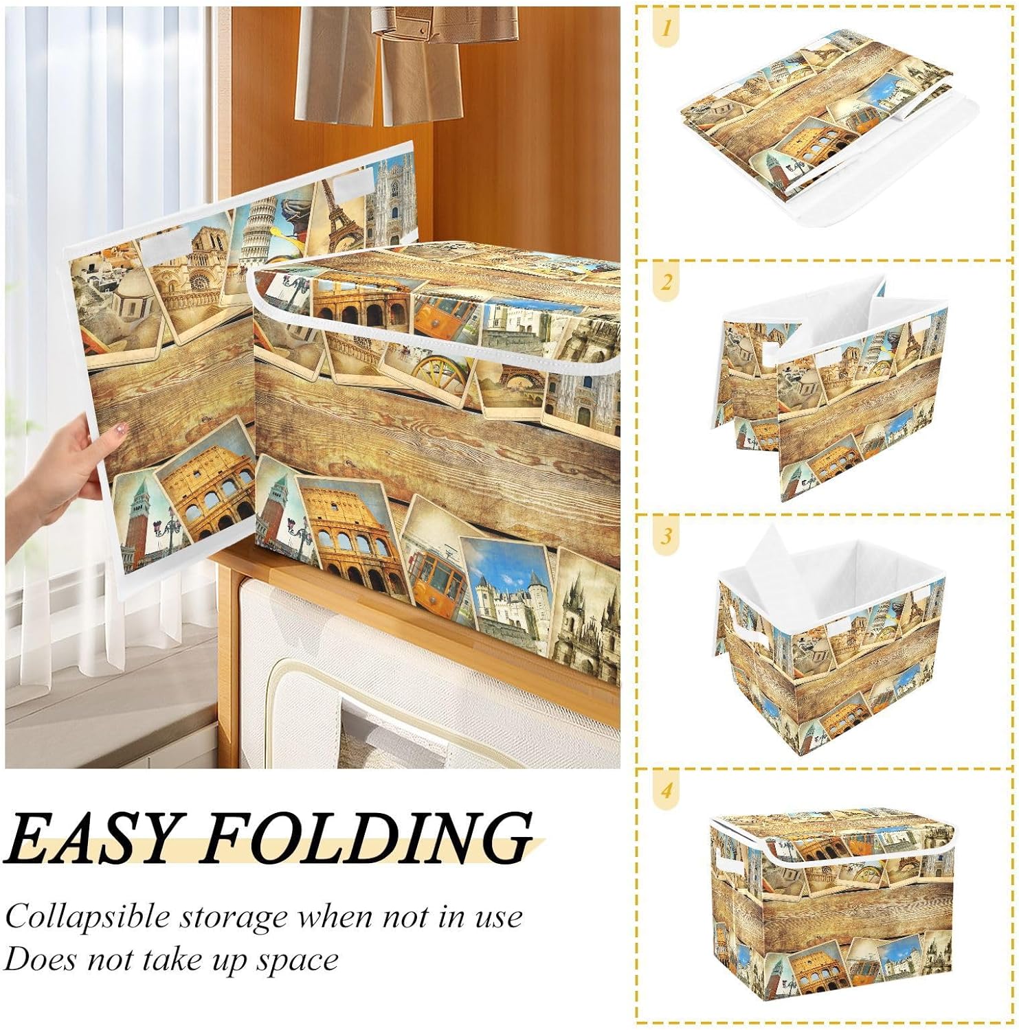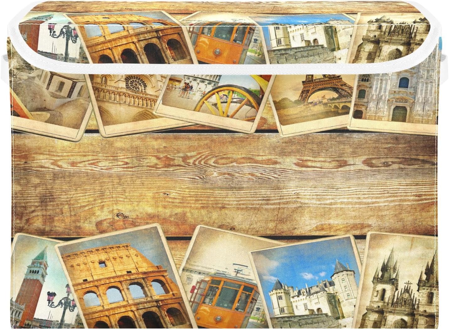 susiyo Vintage Parisian Attractions fabric storage baskets with lids,Collapsible Storage Boxes,Foldable storage boxes with handles for Home,Office,Closet Organization