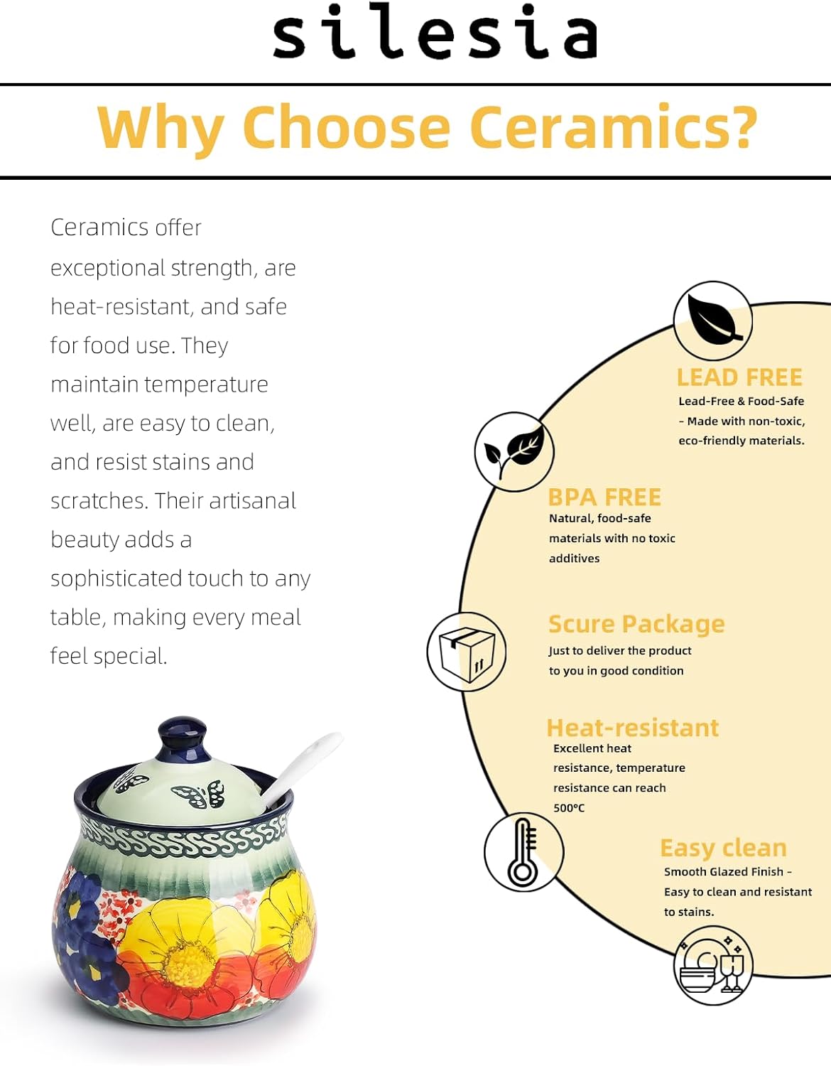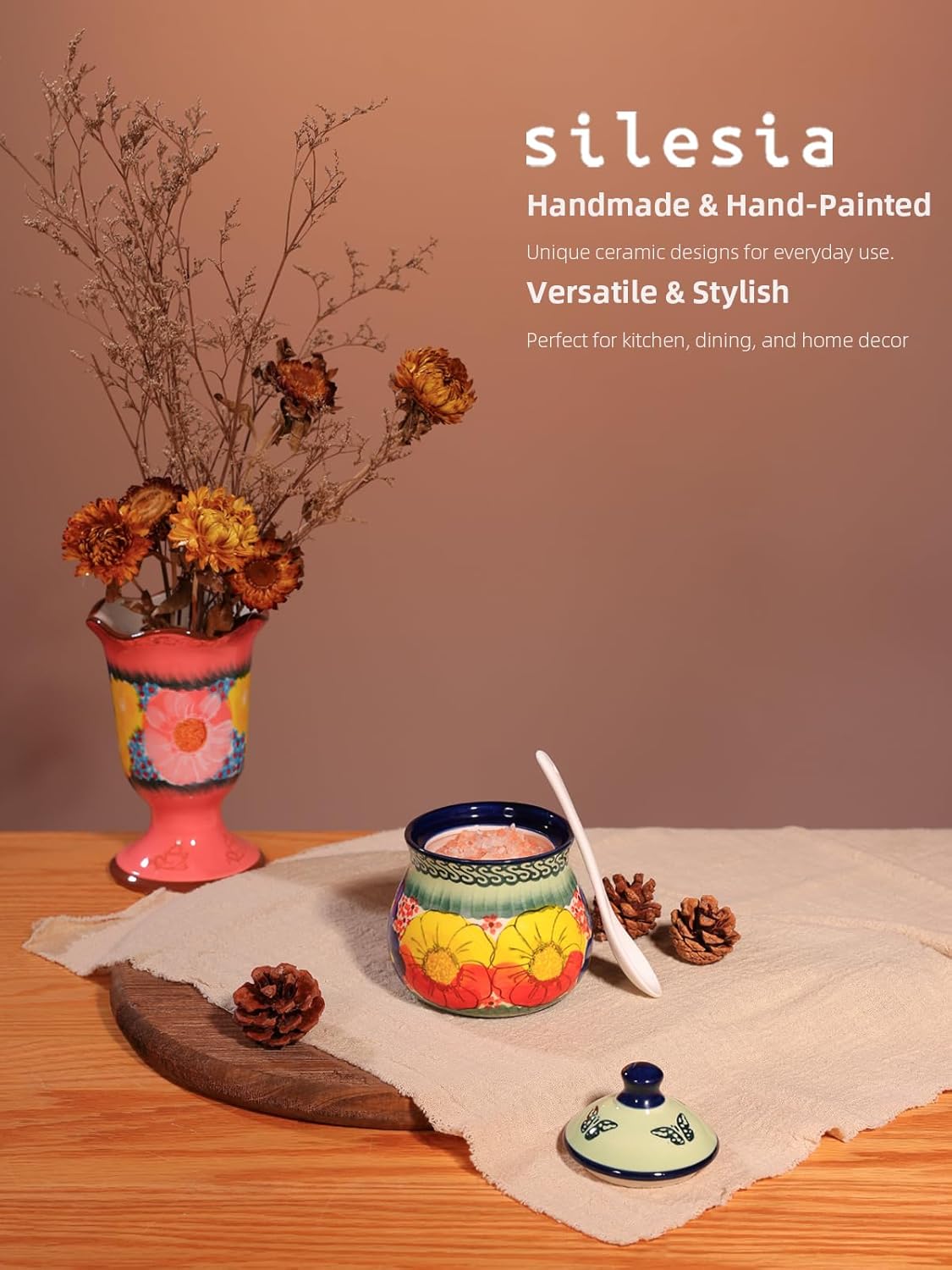 - Beautiful Hand-Painted Design: The sugar bowl features a unique, hand-painted design, showcasing vibrant colors and intricate patterns. This artisanal touch adds charm and character, making it a perfect decorative piece for your kitchen or dining table. Each piece is slightly different, reflecting the craftsmanship behind it