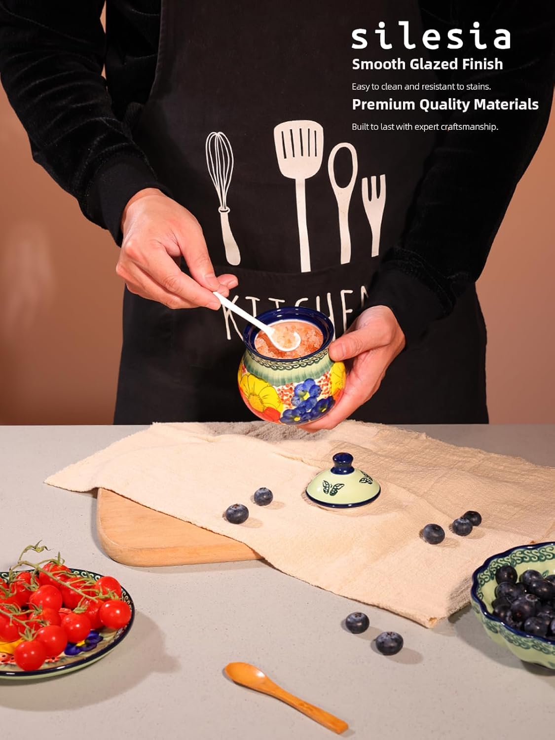- Convenient Ceramic Spoon: The set includes a matching ceramic spoon,The spoon fits neatly into a small slot on the lid, ensuring easy access while keeping everything organized. Perfect for scooping sugar, salt, or other condiments without mess