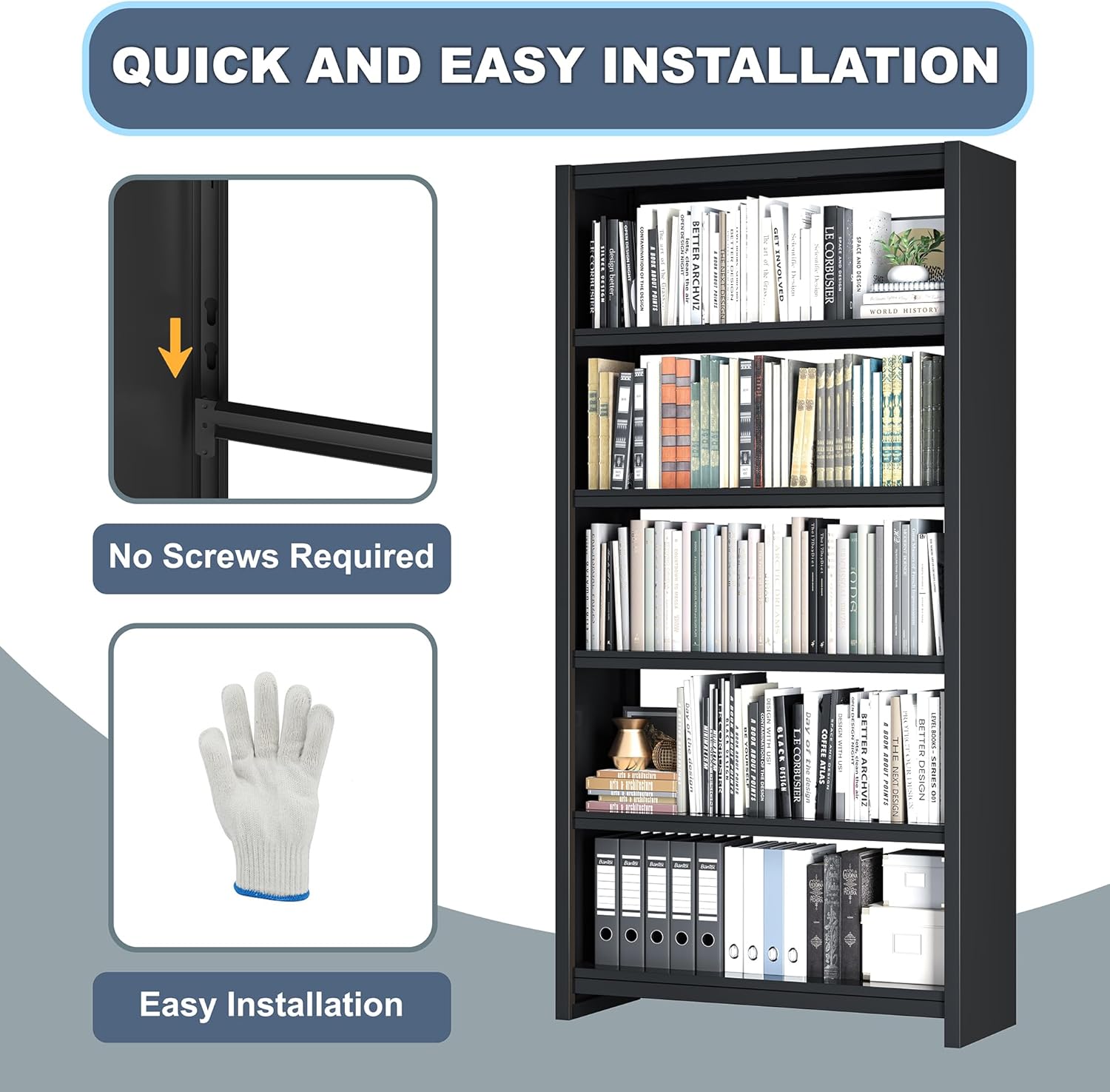 Bookshelf, 5 Shelf Bookcases, Tall Bookcase for Heavy Books, CDs, Movies, Garage Kit, Modern Display Shelf for Library Home Office Bderoom Living Room, Metal Bookshelves Industrial Black