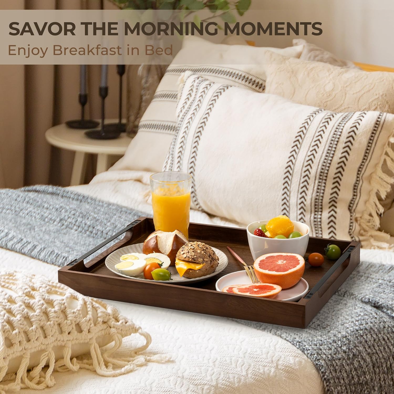 - Versatile Functionality: Measuring 17x13x1.6 inches, this elegant walnut serving tray has the perfect size to fit your favorite foods and yet is lightweight enough for easy carrying when the bed serving tray is full. Ideal for use as coffee tray, bandeja de madera para decoración, table trays decorative, fits perfectly with home decor themes, breakfast trays for bed, tray for couch, wooden ottoman tray, cocktail tray, coffee table tray & wood food tray