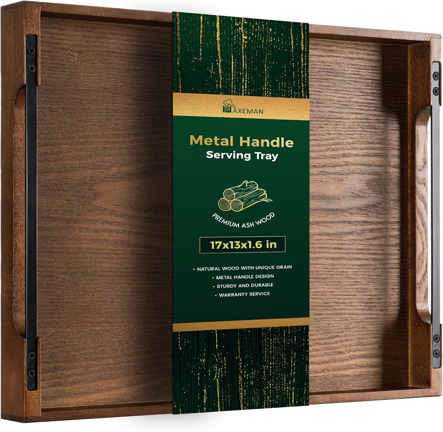 Axeman Wooden Serving Tray with Metal Handles|Ottoman Tray for Breakfast, Bed, Couch|17x13in Ash Wood Coffee Table Trays|Food Drinks Decorative Storage Boards for Ottoman Kitchen, Walnut