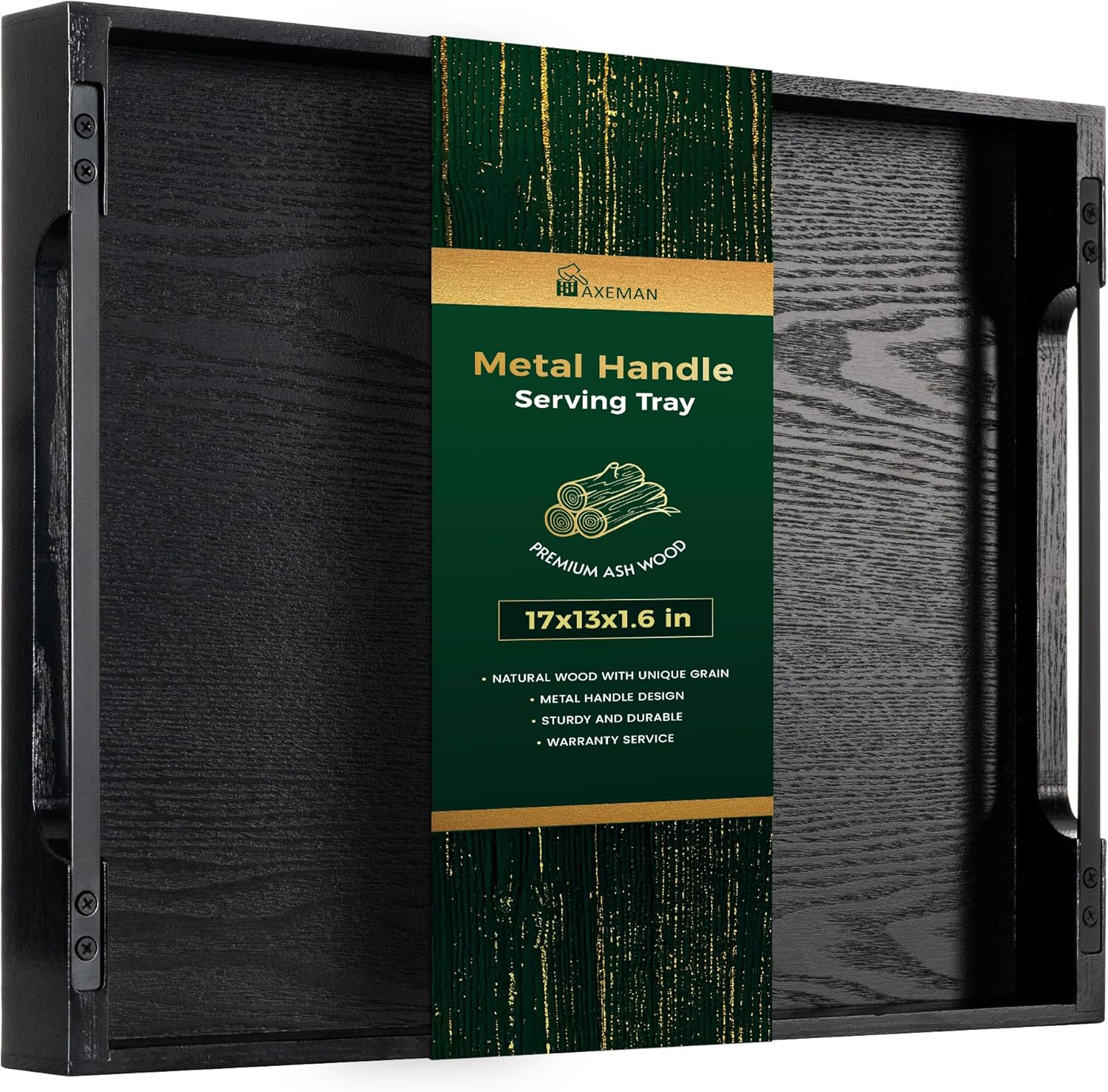 Axeman Wooden Serving Tray with Metal Handles|Ottoman Tray for Breakfast, Bed, Couch|17x13in Ash Wood Coffee Table Trays|Food Drinks Decorative Storage Boards for Ottoman Kitchen, Black
