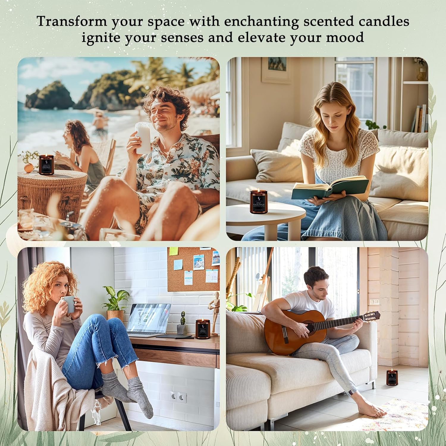 - Candles Set: Including 4 delightful scents, refreshing Peppermint Eucalyptus, warm Vanilla Coconut, exotic Bergamot Sandalwood, and invigorating Sage Citrus. Each scent has been carefully selected to create a harmonious balance that promotes tranquility and revitalization, making them perfect for unwinding after a long day or setting the mood for a cozy gathering