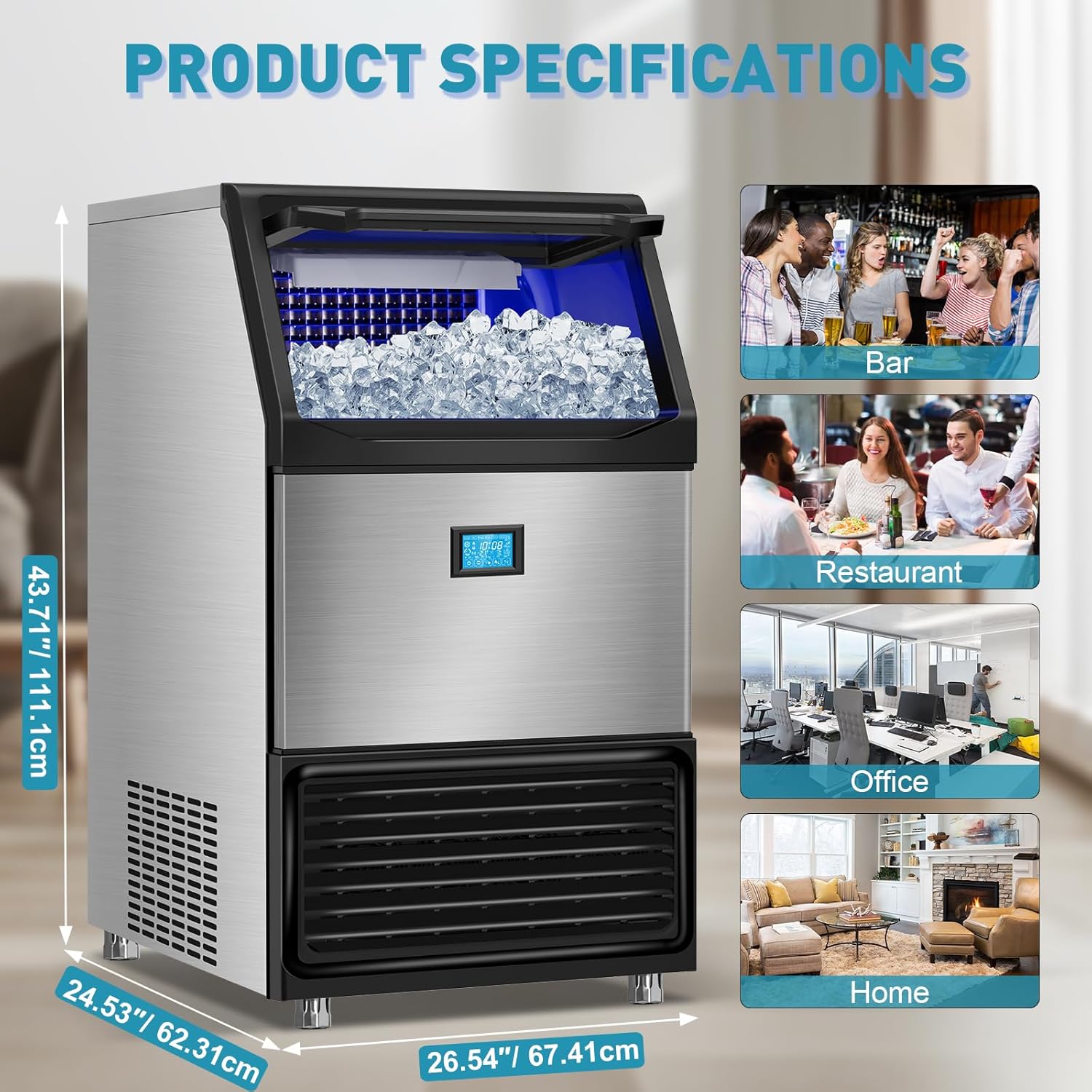 - 【EFFICIENT ICE MAKING & LARGE STORAGE】-The Professional Commercial Ice Maker operates with an efficient powerful compressor for rapid ice making, which can quickly produce up to 550lbs of pure ice cubes in 24h (each cycle of ice-making takes about 11-15min) with its large ice tray (19*8pcs). A large storage capacity of 185lbs makes this ice maker perfect for bars, restaurants, hotels, etc., ensuring a surplus of ice for any occasion.