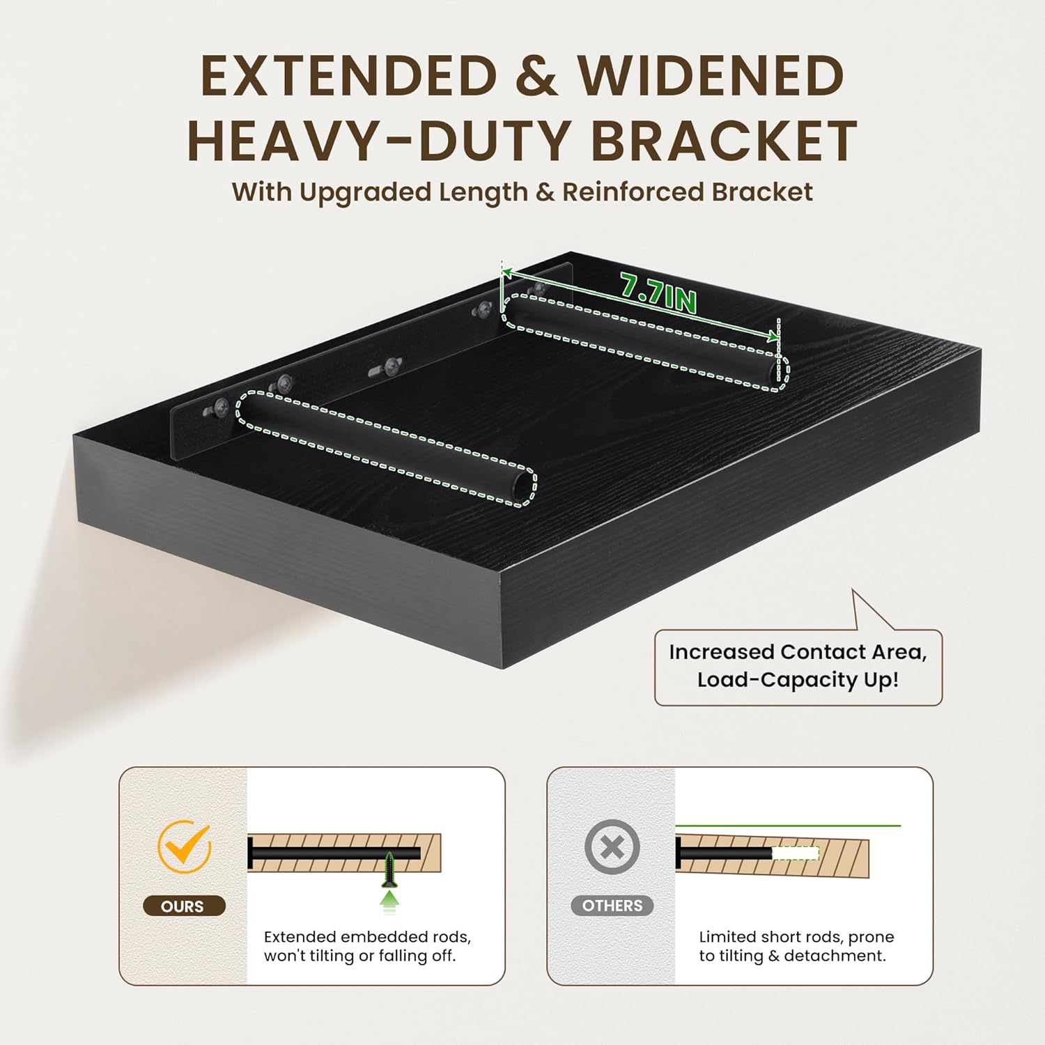 - UPGRADED MOUNTING SYSTEM-The extended supporting bars on the metal brackets ensure our wall shelves remain sturdy, preventing any wobbling or sagging. Plus, the included plastic plugs guarantee the shelves to stay firmly in place