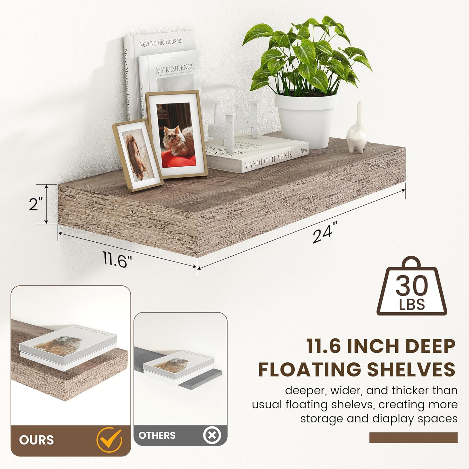 - 12 INCH DEEP FLOATING SHELVES FOR WALL-Elevate your home decor with FLYJOE deep floating shelves, measuring 24 inches wide, 11.6 inches deep, and 2 inches thick. The deeper and thicker design offers unparalleled storage and display possibilities, making them a must-have for any room