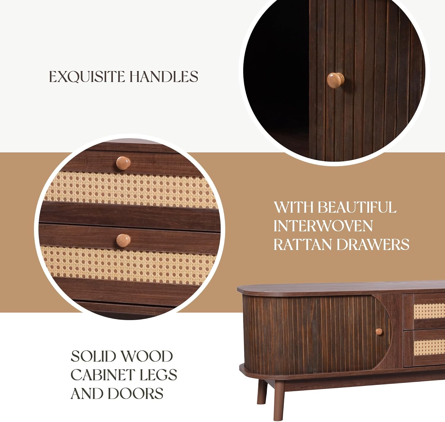 - Sturdy Construction - Crafted from TSCA compliant MDF for lasting beauty and durability, this fluted entertainment unit flaunts a dark walnut texture complementing the natural rattan color, emphasizing the aesthetic look. Supported by well proportioned 4 solid wood legs