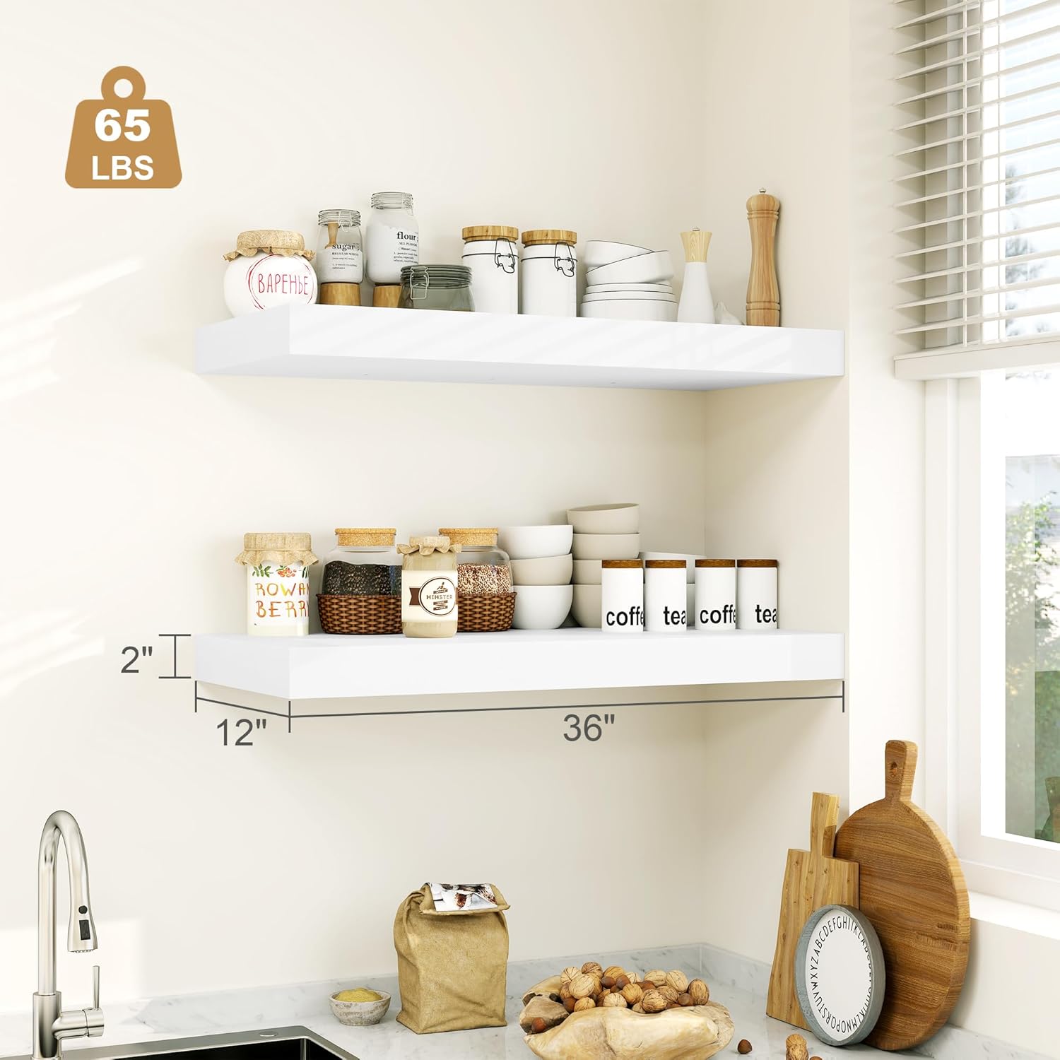 - 12 Inches Deep Floating Shelves :This extra deeper and thicker wall shelves are 36"L x 12"D x 2" H,with a capacity of 65Lbs. Our shelves for wall decor create a variety of storage spaces to organize small items on your desktop or counter.and they blend seamlessly with the rest of other decor and provide a stylish way to organize and display items.