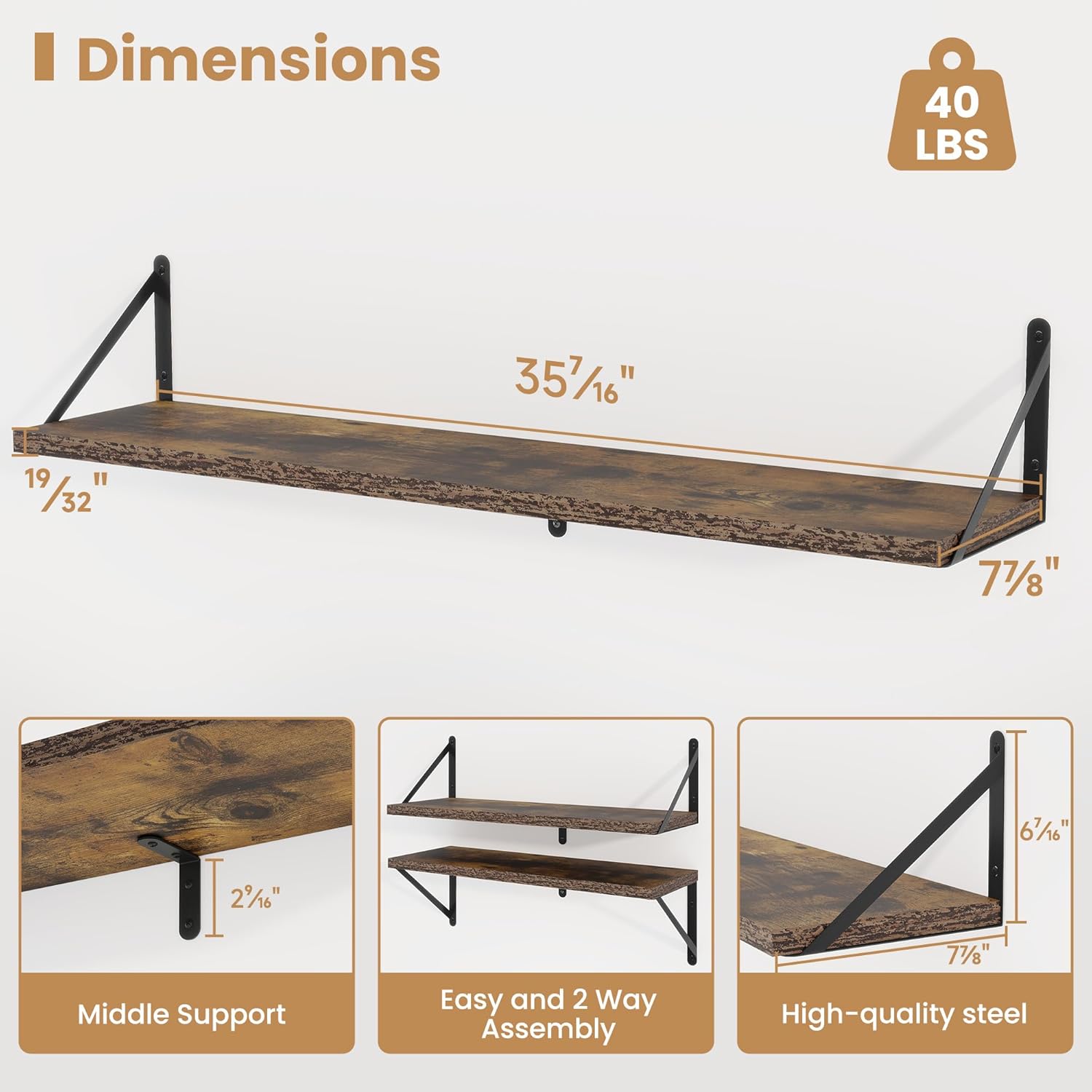 Heimlove 36 Inch Floating Bookshelves Set of 3,Heavy Duty Wall Mounted Bookshelves,Rustic Brown Wall Bookshelf for Living Room,Bedroom,Kitchen,Laundry Room Storage & Decor