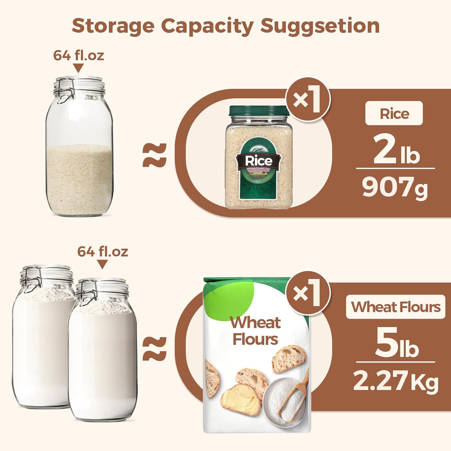 - Long-Lasting Freshness Jars: These kitchen canisters are perfect for long-term storage of dry goods like rice, pasta, or pet treats. The half gallon jars provide ample space for bulk foods, keeping food fresh and organized for extended periods