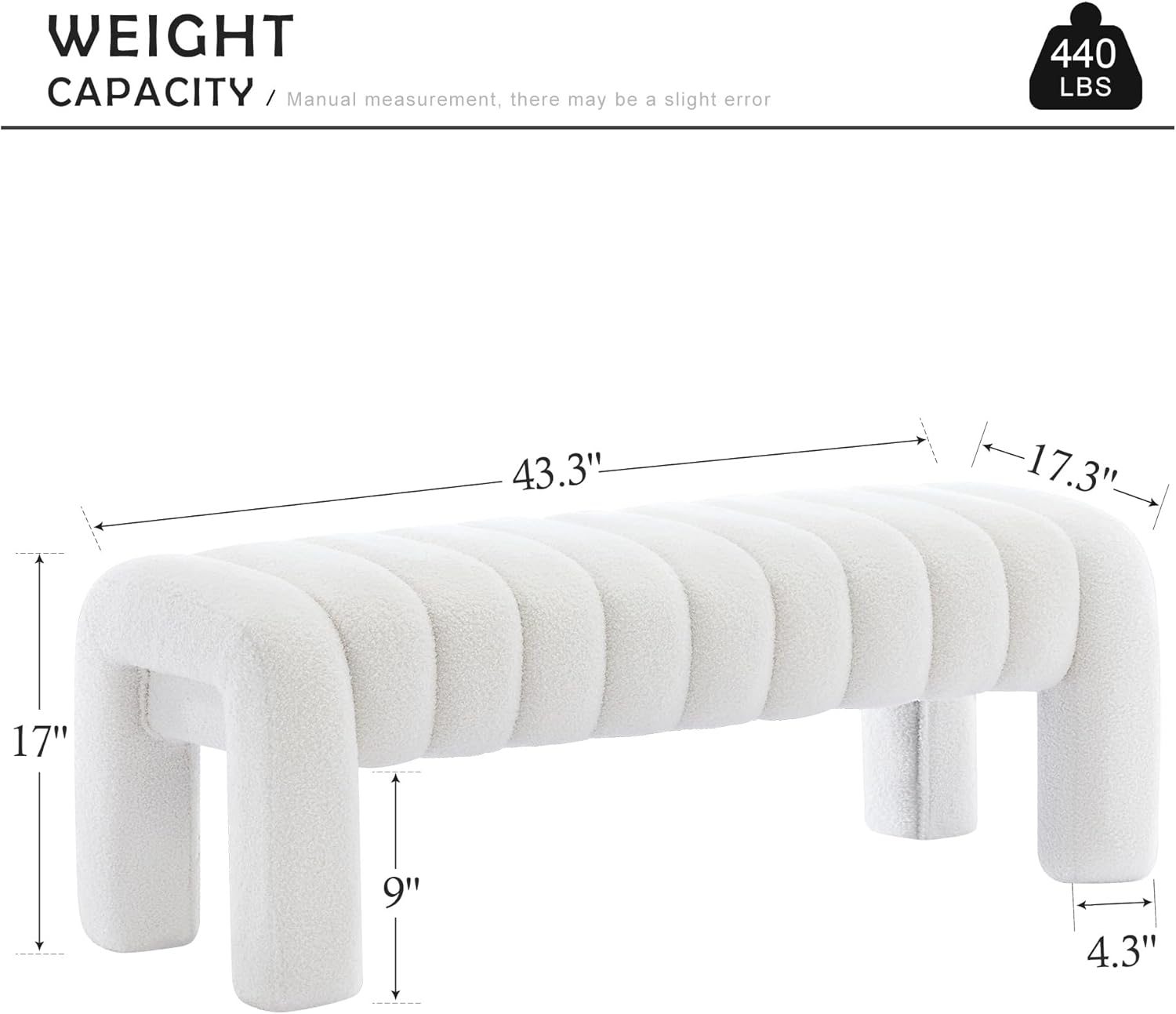 43.3" Bedroom Bench, Upholstered Entryway Bench, Modern End of Bed Ottoman with Solid Wood Legs and Adjustable Foot Pegs for Entryway, Dining Room and Living Room (White Teddy)